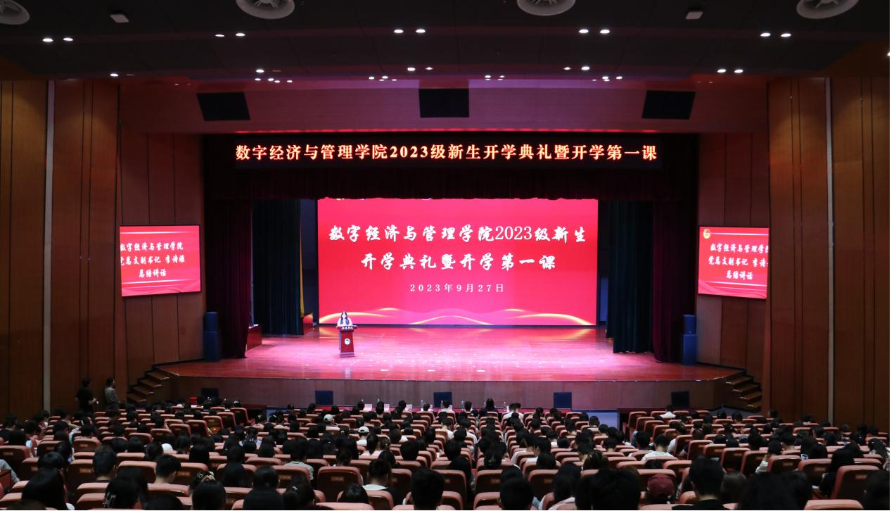 9月27日,数字经济与管理学院在滨江大礼堂二楼举行2023级新生开学典礼暨开学第一课。学院院长刘军,党总支副书记李诗雅,全体2023级新生及新生辅导员、班主任,青年领航计划志愿者,学院工作人员参加典礼。会议由李诗雅主持。
