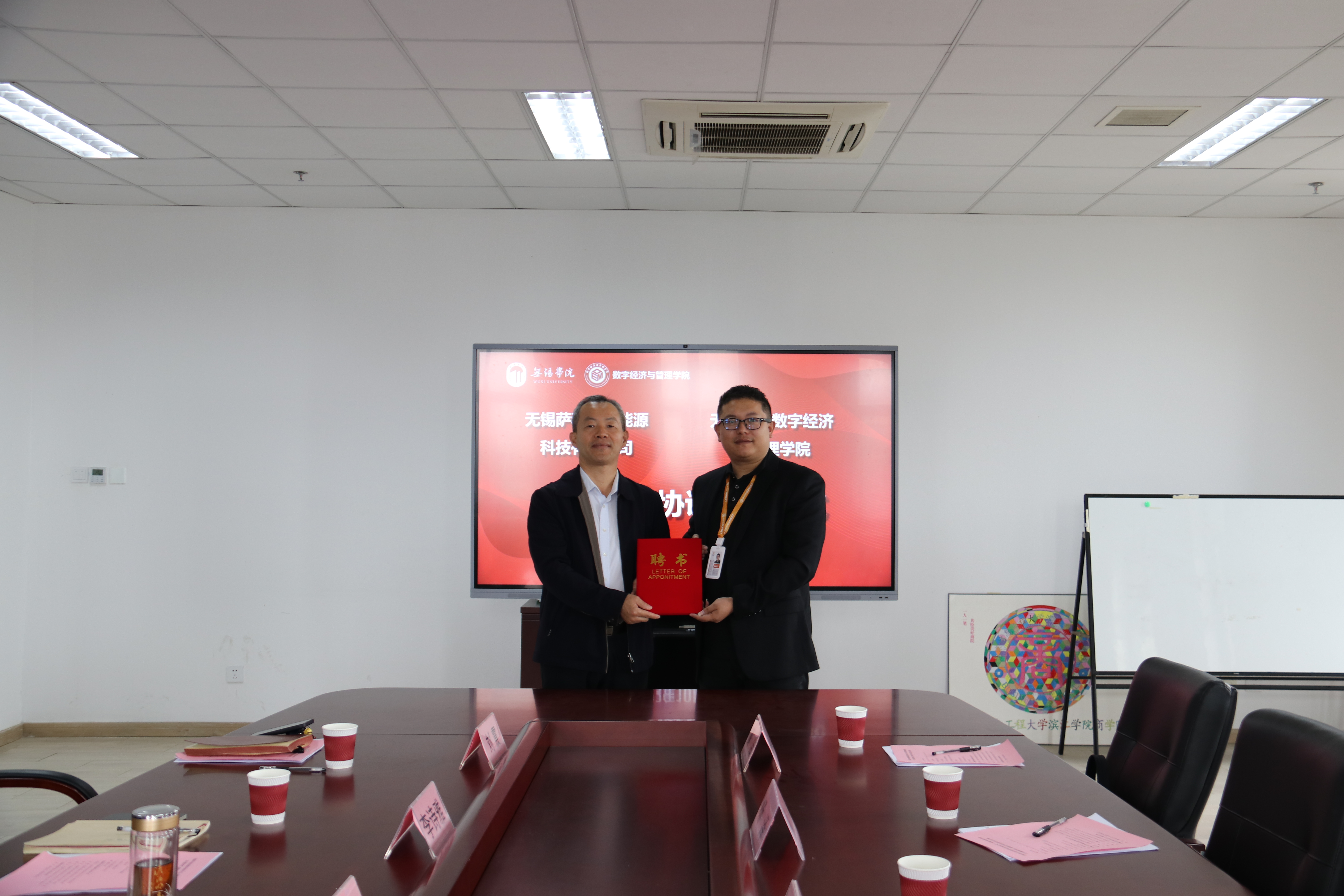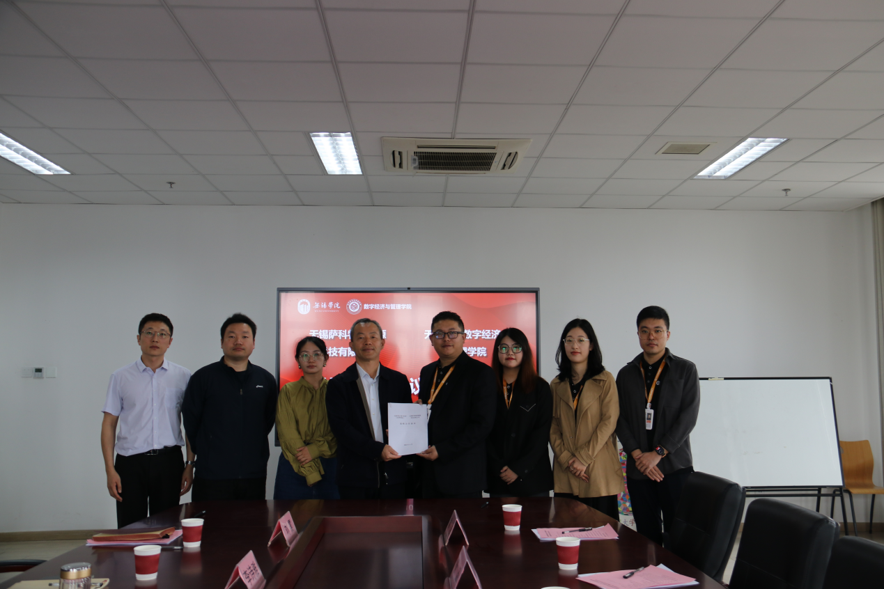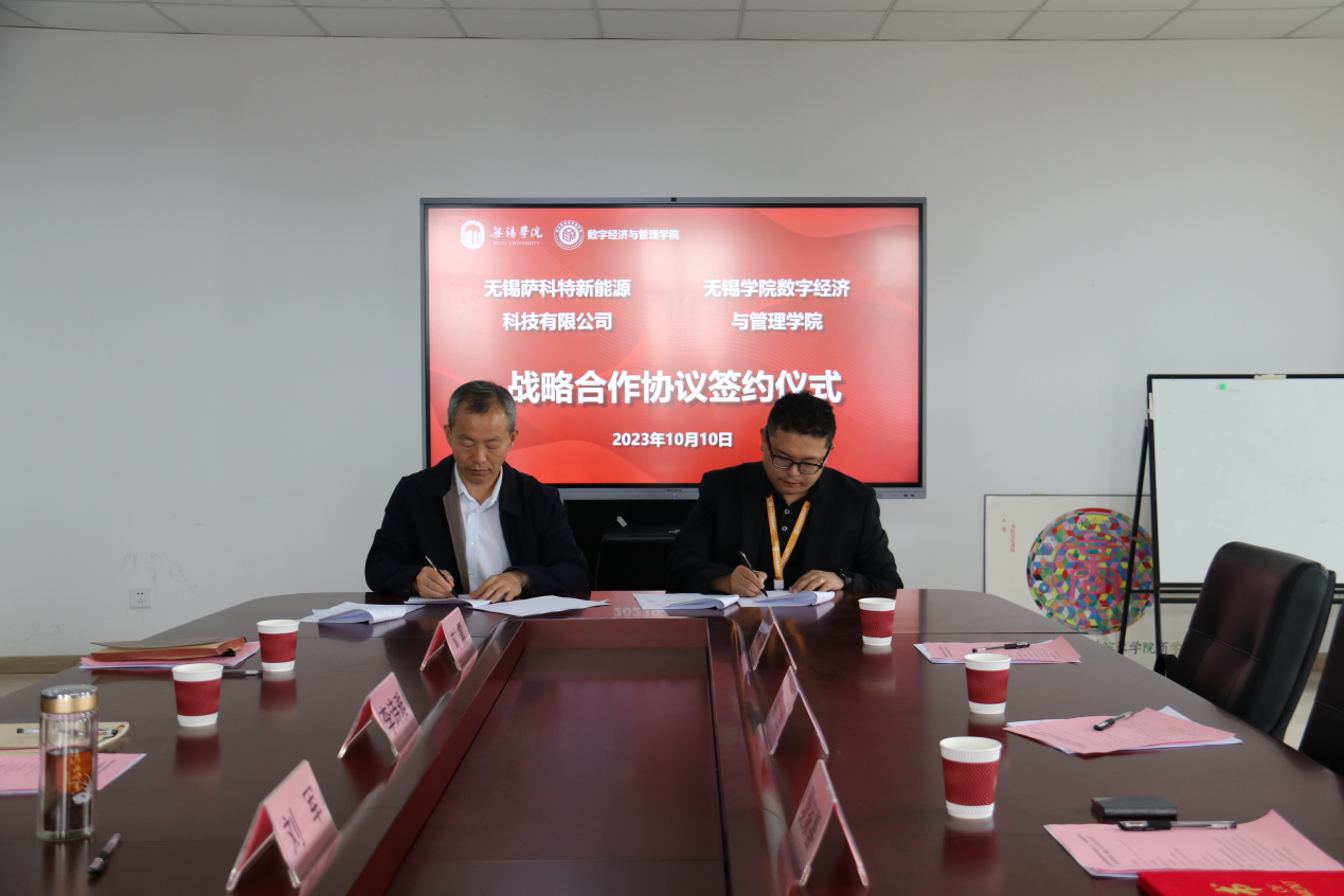 10月10日上午,数字经济与管理学院与无锡萨科特新能源科技有限公司举行战略合作协议签约仪式。无锡萨科特新能源科技有限公司副总经理夏家喜,数字经济与管理学院院长刘军、党总支副书记李诗雅及双方相关工作人员参加会议。