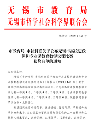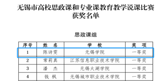 10月17日,无锡市教育局、无锡市哲学社会科学界联合会公布了2023年无锡市高校思政课和专业课教育教学说课比赛决赛结果,我校马克思主义学院陈诗雯老师荣获思政课组一等奖,轨道交通学院董伟光老师荣获专业课组一等奖。