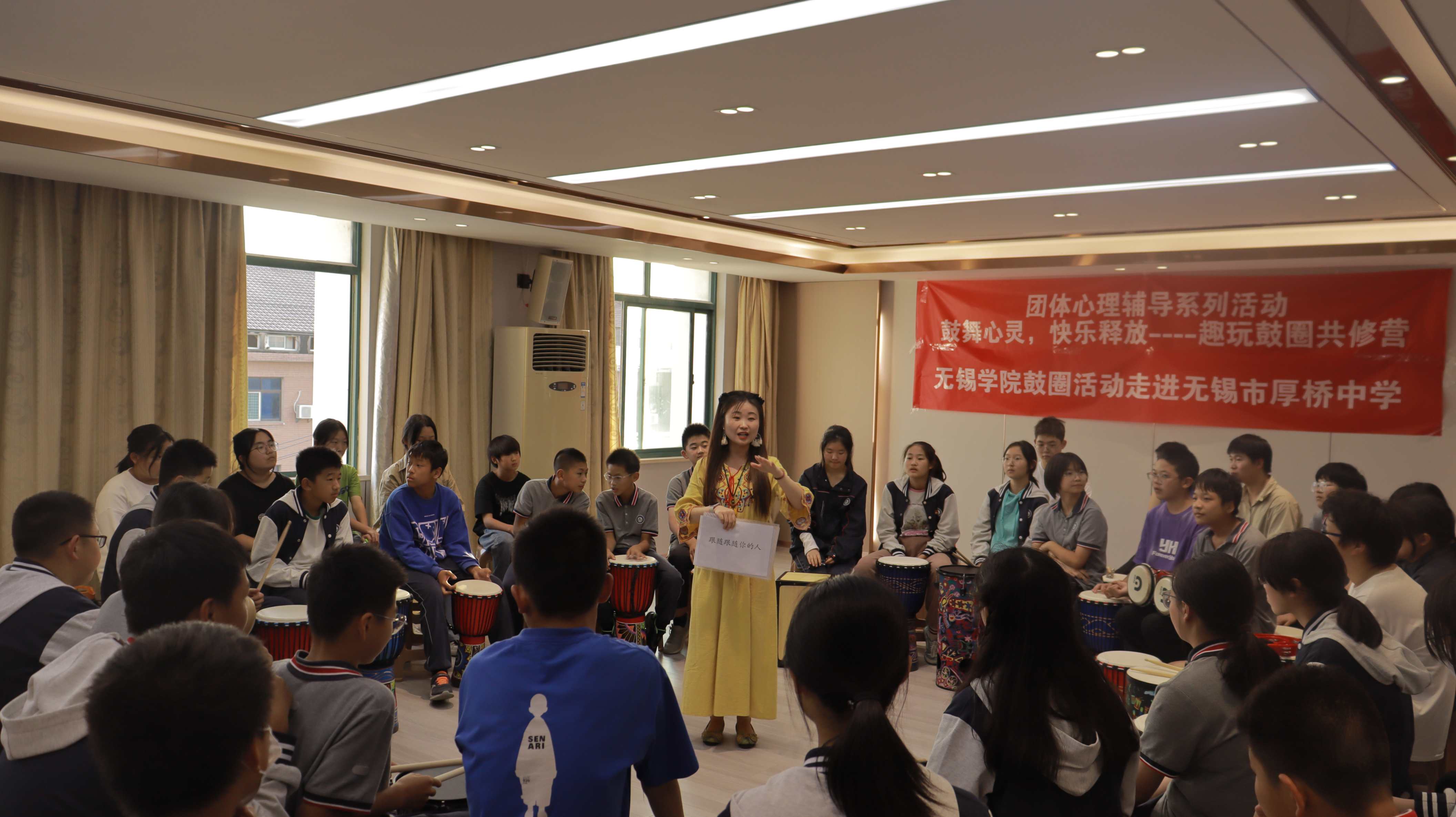 为深入贯彻省教育厅《关爱青少年生命健康“润心”行动方案》精神,扩大我校心理健康教育和心理关怀的广度和深度,做好社会心理服务工作,帮助青少年建立积极心理品质,10月18日下午,我校应邀走进无锡市厚桥中学开展鼓圈团体减压活动。