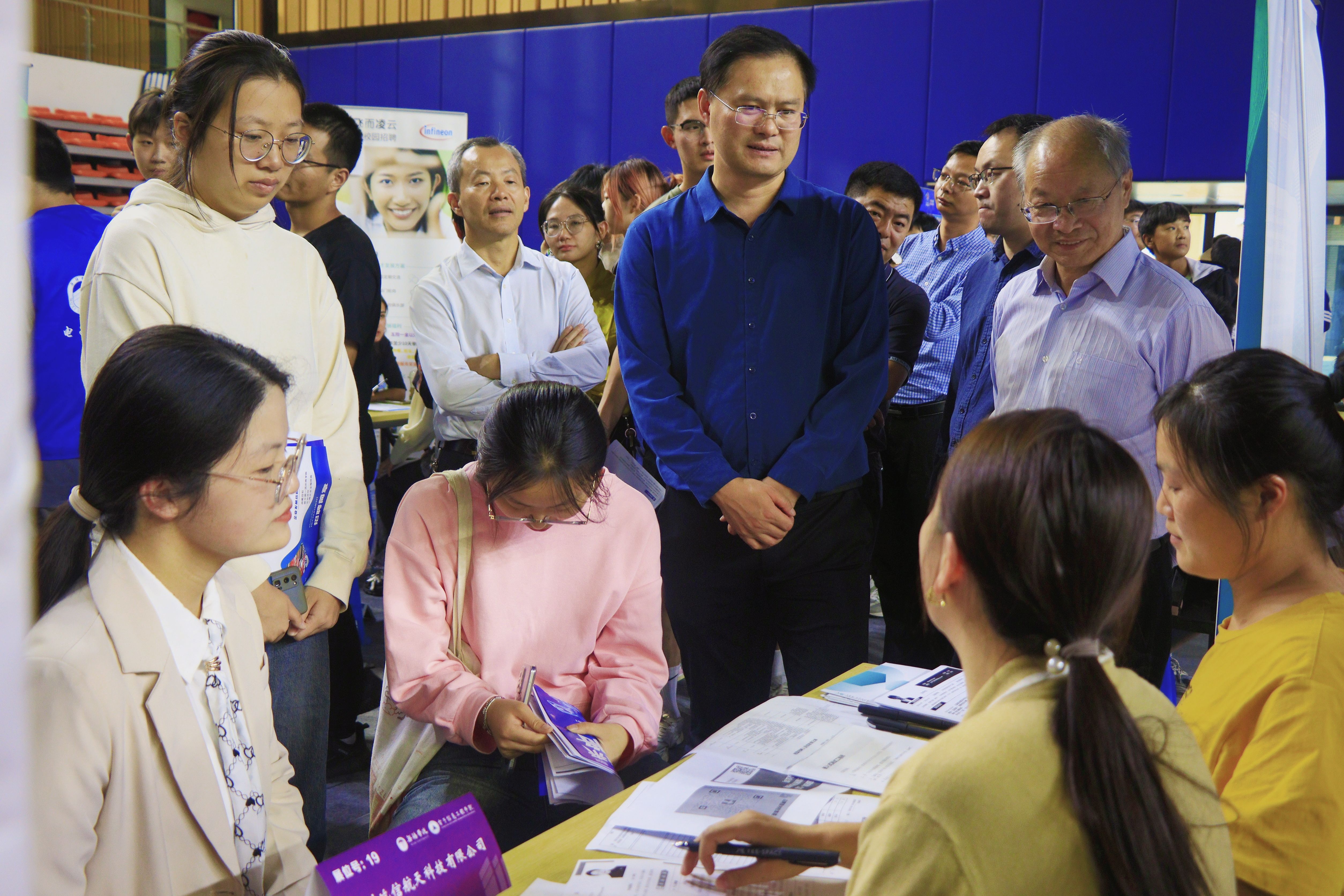 左同宇表达了对各企业来校招聘的感谢,并向他们了解当下行业发展趋势和用人单位的需求,希望他们能提供更多的工作岗位,积极推动校企联合,共促发展。同时他与学生亲切交谈,鼓励毕业生们好好把握机会,尽快找到自己心仪的工作。