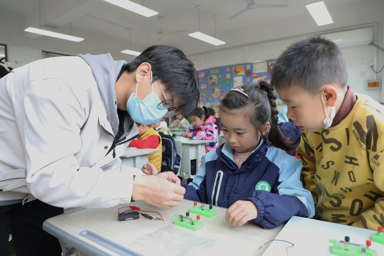 为指导小朋友了解简易电路的组成与安装,引导他们思考所学电路知识在日常生活中的应用,提升安全用电的意识,党员志愿服务先锋队来到新吴区南丰小学三年级1班至6班展开教学。在课堂中,志愿者带领小朋友们学习电路元件,电流、电路等知识,并教授他们绘制简易的电路图,通过实验模拟安装照明电路。