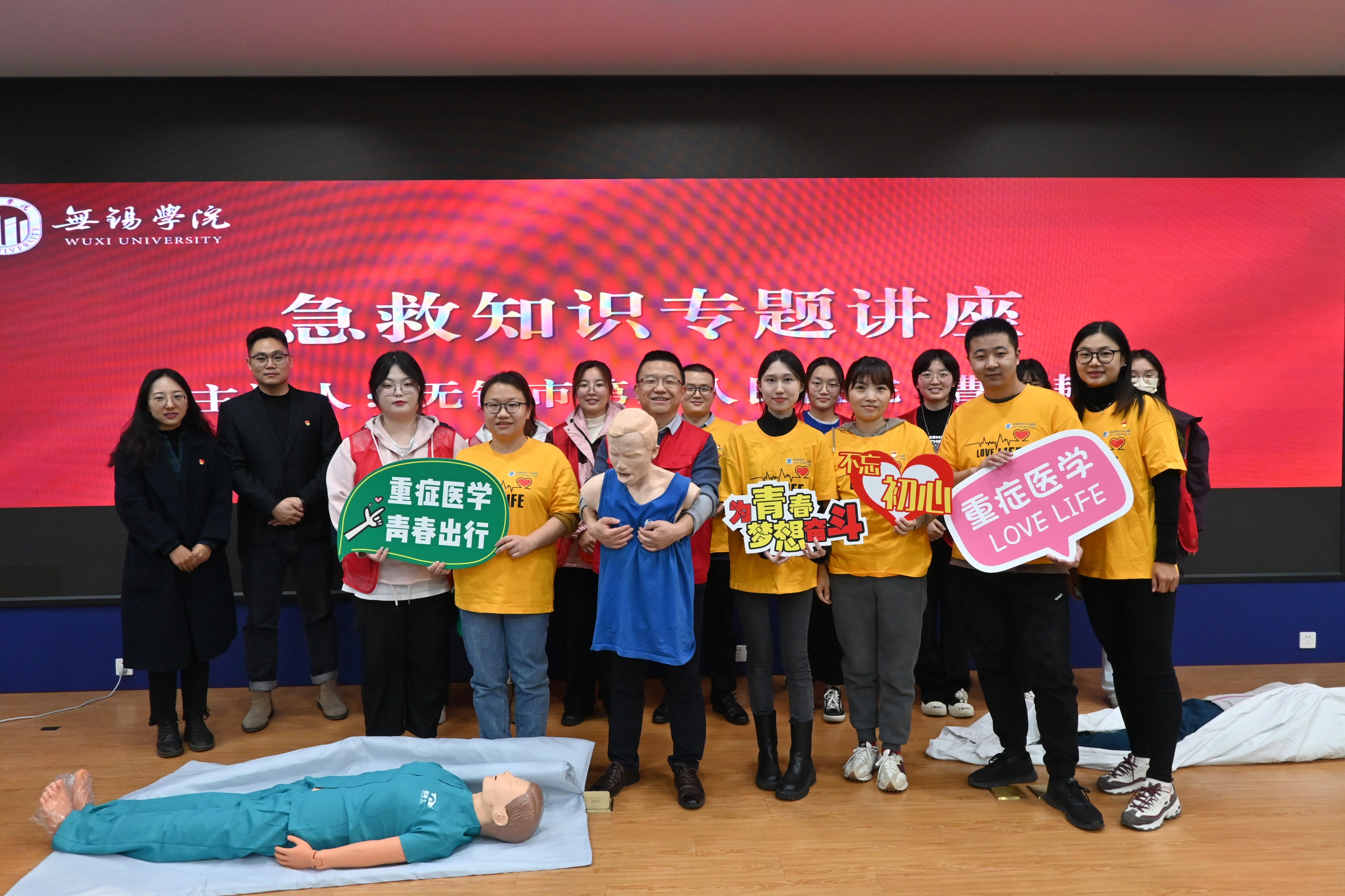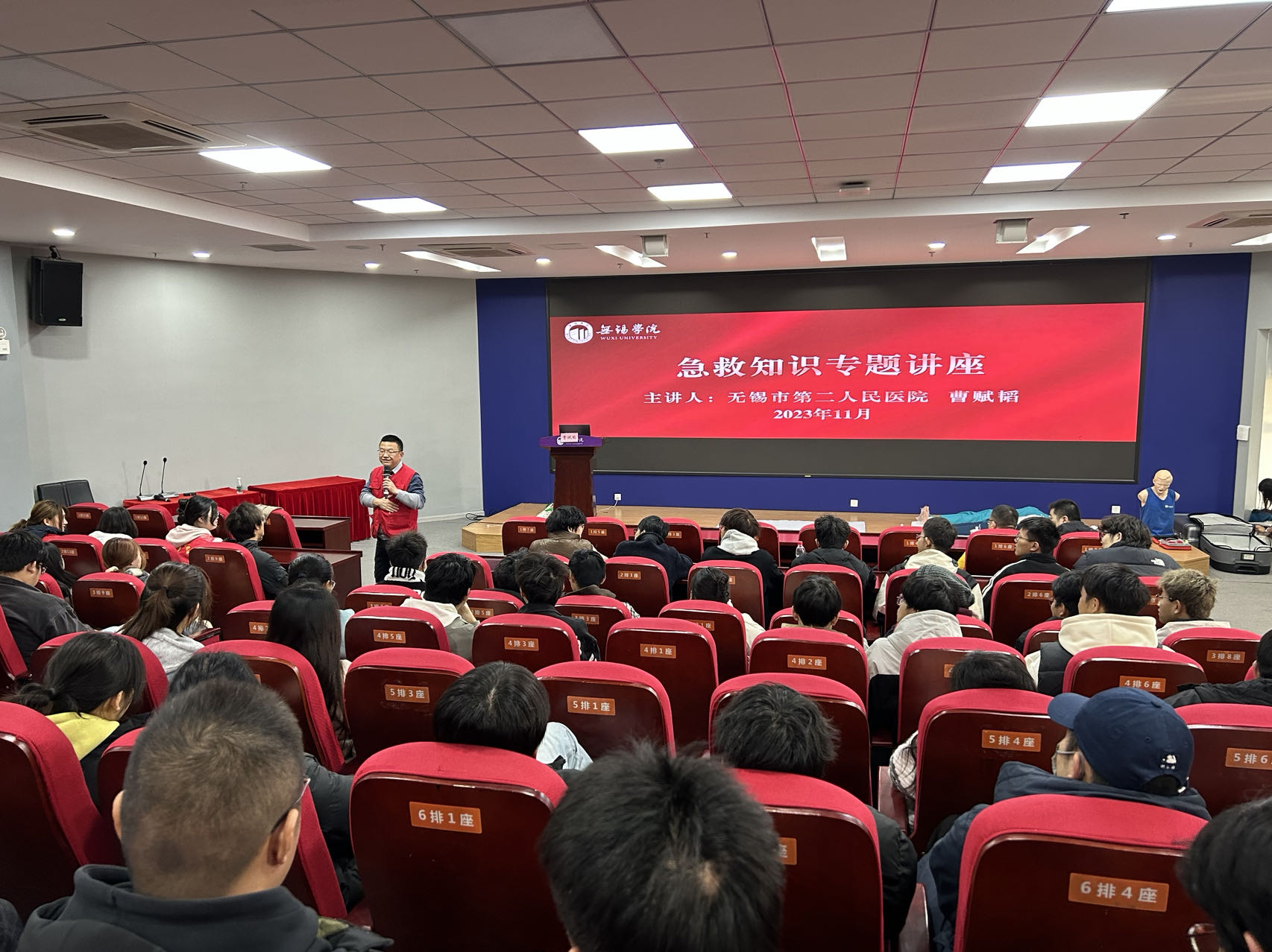 11月30日下午,无锡市第二人民医院门诊医技党总支书记、重症医学科副主任曹赋韬等一行7人来校作《急救知识》专题讲座,并开展应急救护培训活动。讲座由团委副书记余润阳主持,全校130余名师生参加。