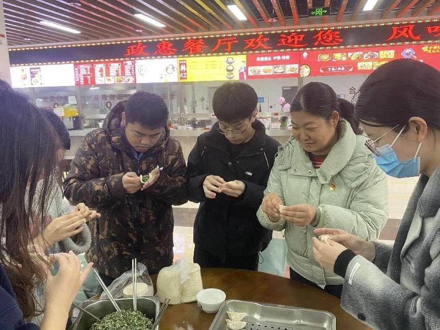 随后,师生一起参与了包饺子活动。会包的同学跃跃欲试,大显身手;手法生疏的同学也不甘示弱,纷纷向熟练工们请教。不久,一盘盘形状各异的水饺出炉。食堂工作人员协助大家把饺子煮熟,同学们围着桌子坐在一起,享受这一次难得晚餐。借此机会,老师也对学生的生活和学习情况进行了了解和关心。