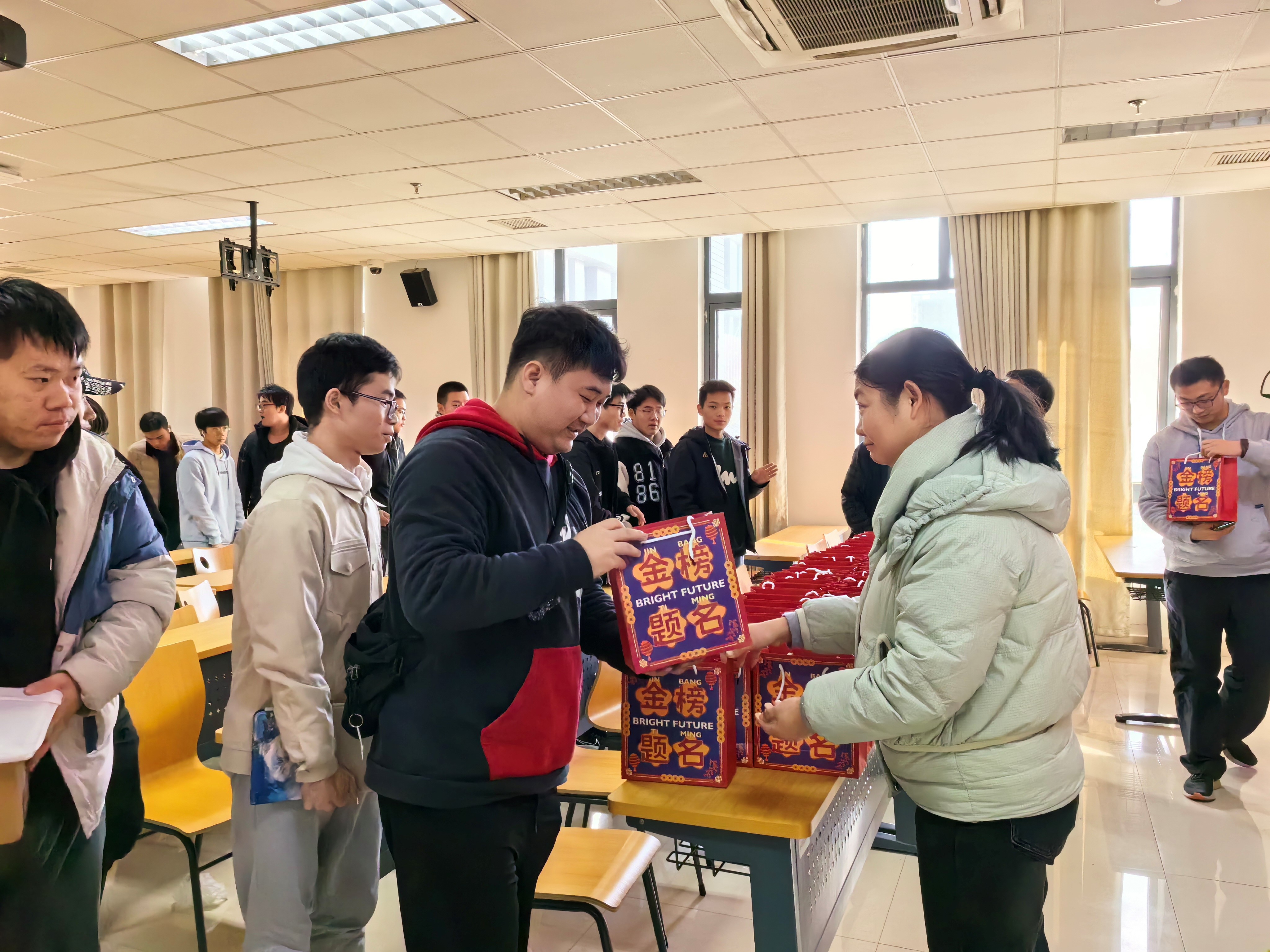 随后,老师们向在场全体同学发放了考研大礼包。礼包内包含文具套装和水果,寓意丰富:文具套装含有孔庙元素,意在祝愿同学们文思泉涌;橙子意指一战“橙”硕;苹果意指“苹”稳上岸,饱含了学院对考研学子们浓浓的关爱和殷切的期盼。