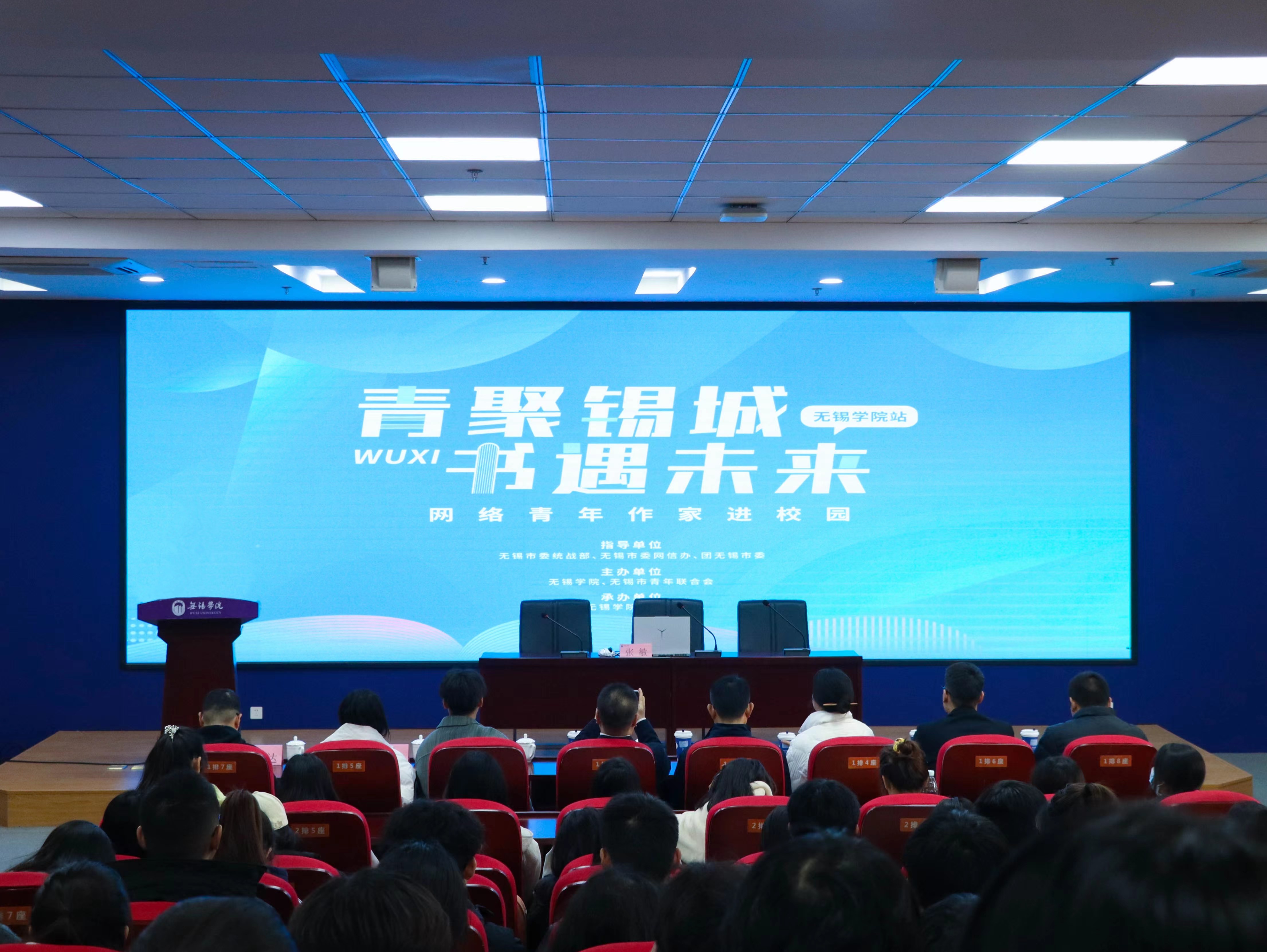 12月6日下午,“青聚锡城,书遇未来”网络青年作家进校园活动在我校成功举办,市委统战部知新处处长王宝林,市委网信办网评处处长周会庆,团市委统战部(社联部)副部长魏乔君,市新联会副会长、锡山团区委副书记(兼职)唐顺涛,无锡学院团委副书记(兼职)余润阳,江苏省作家协会会员、无锡作协理事、无锡市新吴区作协主席、无锡网协副主席、无锡青年作协副主席张敏,江苏省作家协会会员、连云港网络作协理事、新吴区作协理事费友通,无锡市作家协会会员、无锡市网络作家协会理事、无锡市青年作家协会会员、新吴区作家协会副秘书长徐晨达出席活动。