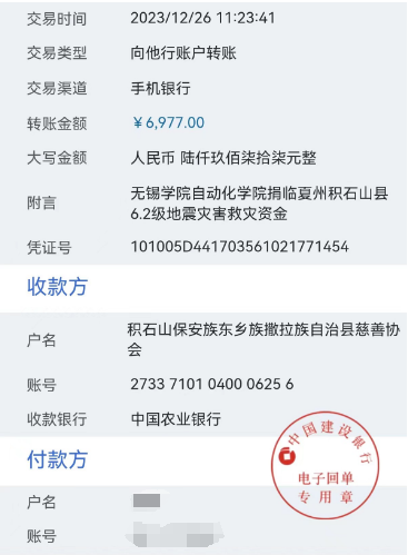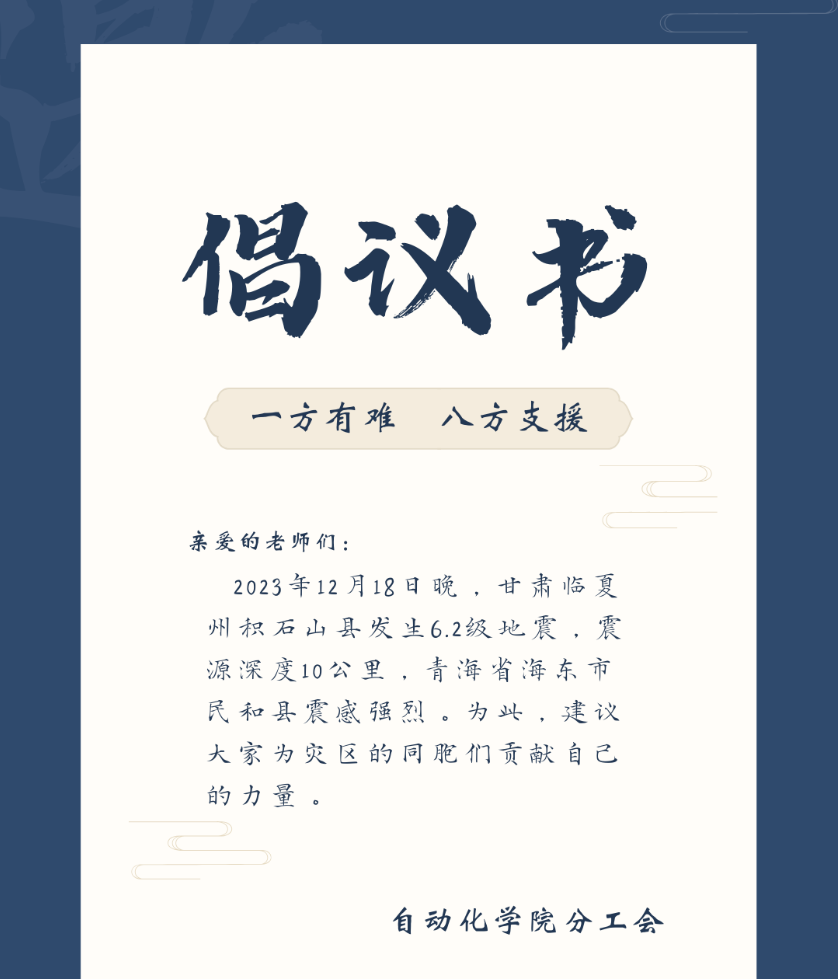12月18日,甘肃临夏州积石山县发生6.2级地震,震源深度10公里,青海省海东市民和县震感强烈,造成上百人伤亡,上万人无家可归。一方有难,八方支援,自动化学院教师在分工会的号召之下,第一时间自发捐款献爱心,短短的几天时间,共有50位教师参加募捐活动,累计收到捐款6977元,全部款项已汇入积石山保安族东乡族撒拉族自治县慈善协会账户。