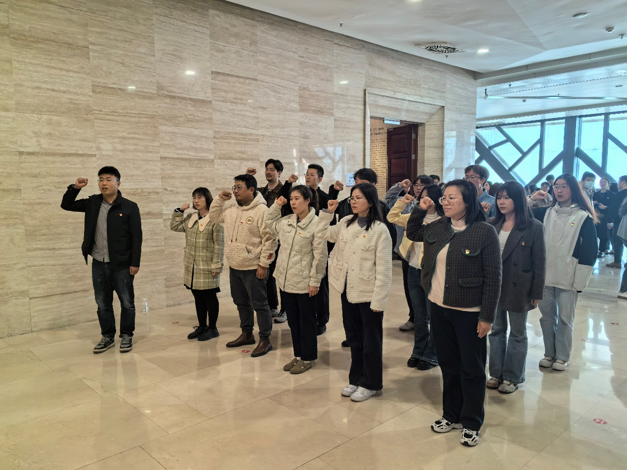 参观结束后,传媒与艺术学院党总支副书记郭新宇带领全体党员来到博物院五楼大厅,重温入党誓词。大家面向鲜红的党旗举起右手,庄严宣誓“我志愿加入中国共产党,拥护党的纲领……”洪亮、激昂的宣誓使每一名党员再次接受到精神的洗礼,增强了在学校事业发展新征程、新起点上干事创业的使命感和责任感。