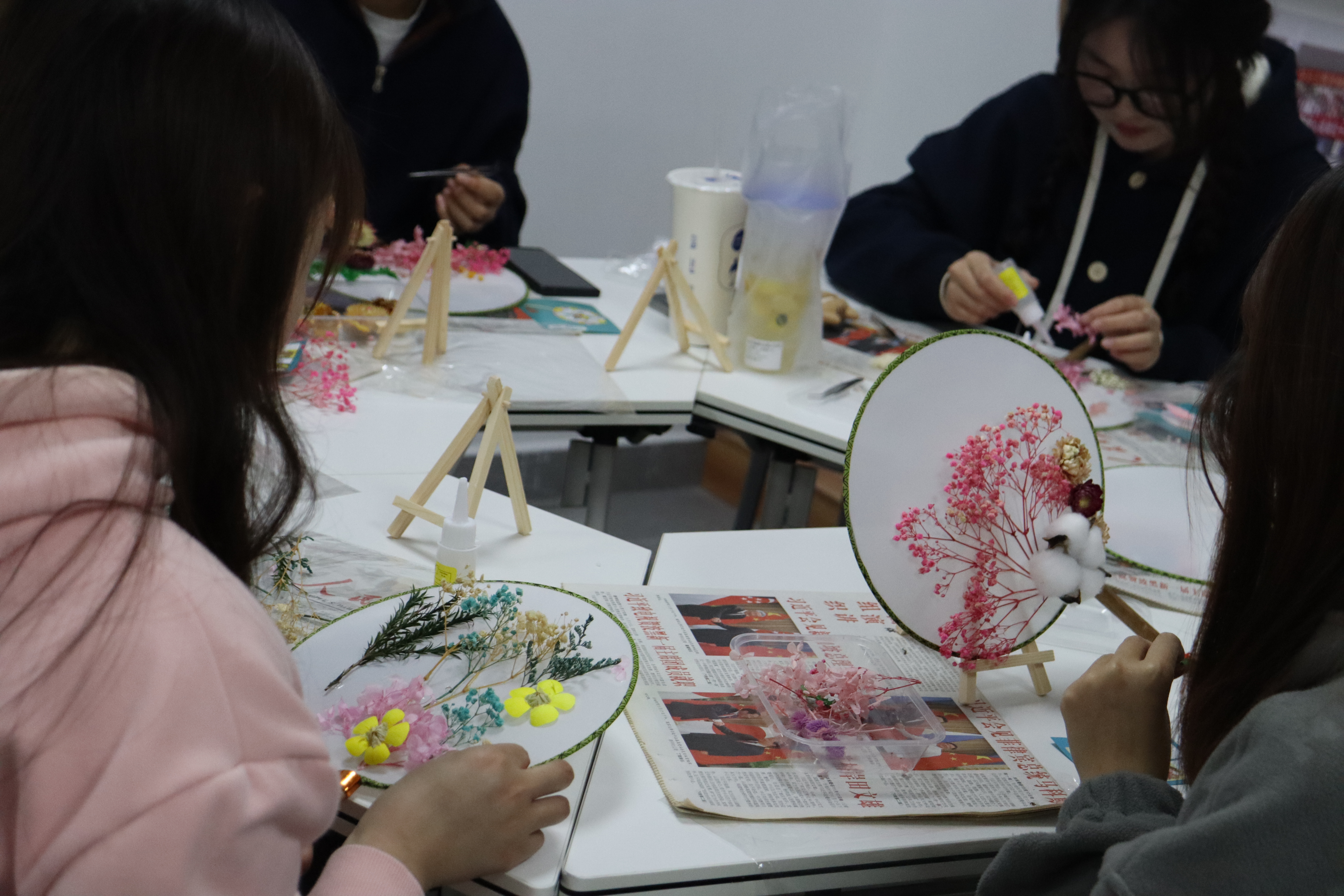 活动现场,同学们领取团扇、干花、胶水等制作材料,经过巧妙构思与劳动实践,展现出不同的审美与内心世界。制作过程中,同学们沉浸在中华优秀传统文化的艺术魅力中,互相帮助,分享感受,既放松了身心,又促进了友谊。制作结束后,大家带着自己亲手设计制作的精美干花团扇,来到校园内樱花树下拍照留念。