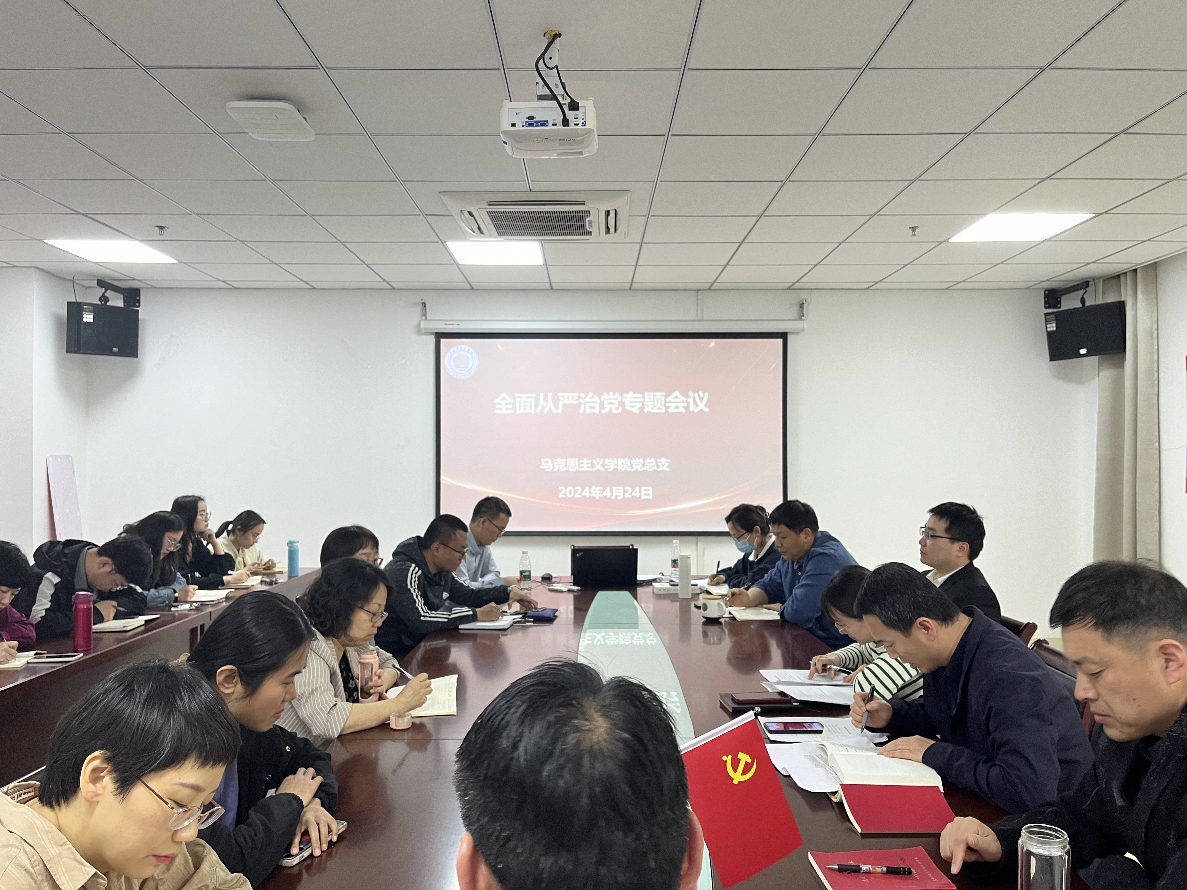 4月24日下午,马克思主义学院在尚真楼110会议室召开党纪学习教育暨全面从严治党工作会议。学院全体党员教师参加会议。会议由党支部书记曲文涛主持。