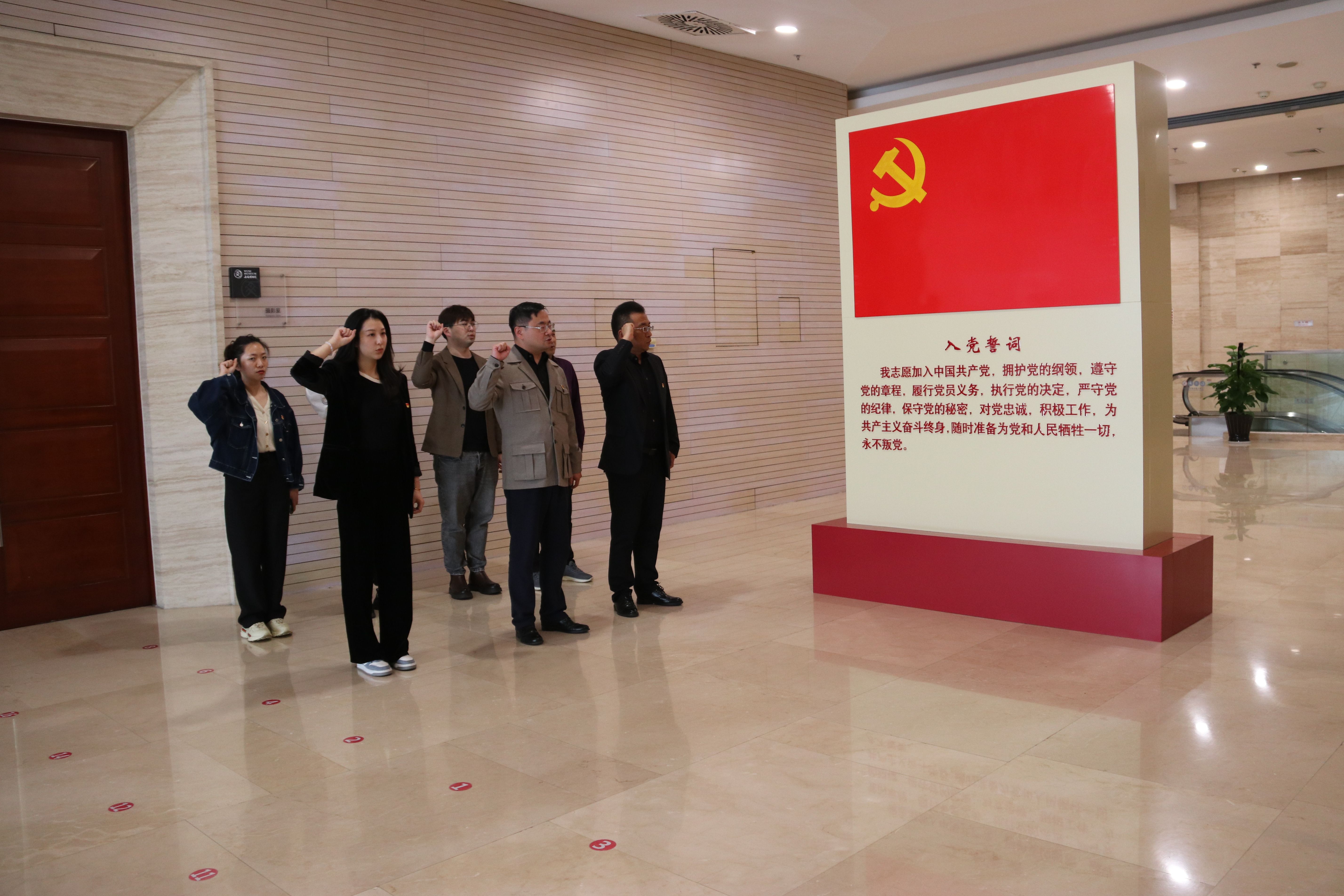 参观结束后,全体党员来到博物院五层大厅重温入党誓词。大家面向鲜红的中国共产党党旗,高举右拳,庄严宣誓,向革命烈士致以崇高的敬意。在铿锵的誓言中,党员同志们的初心受到洗礼,理想信念更加坚定。