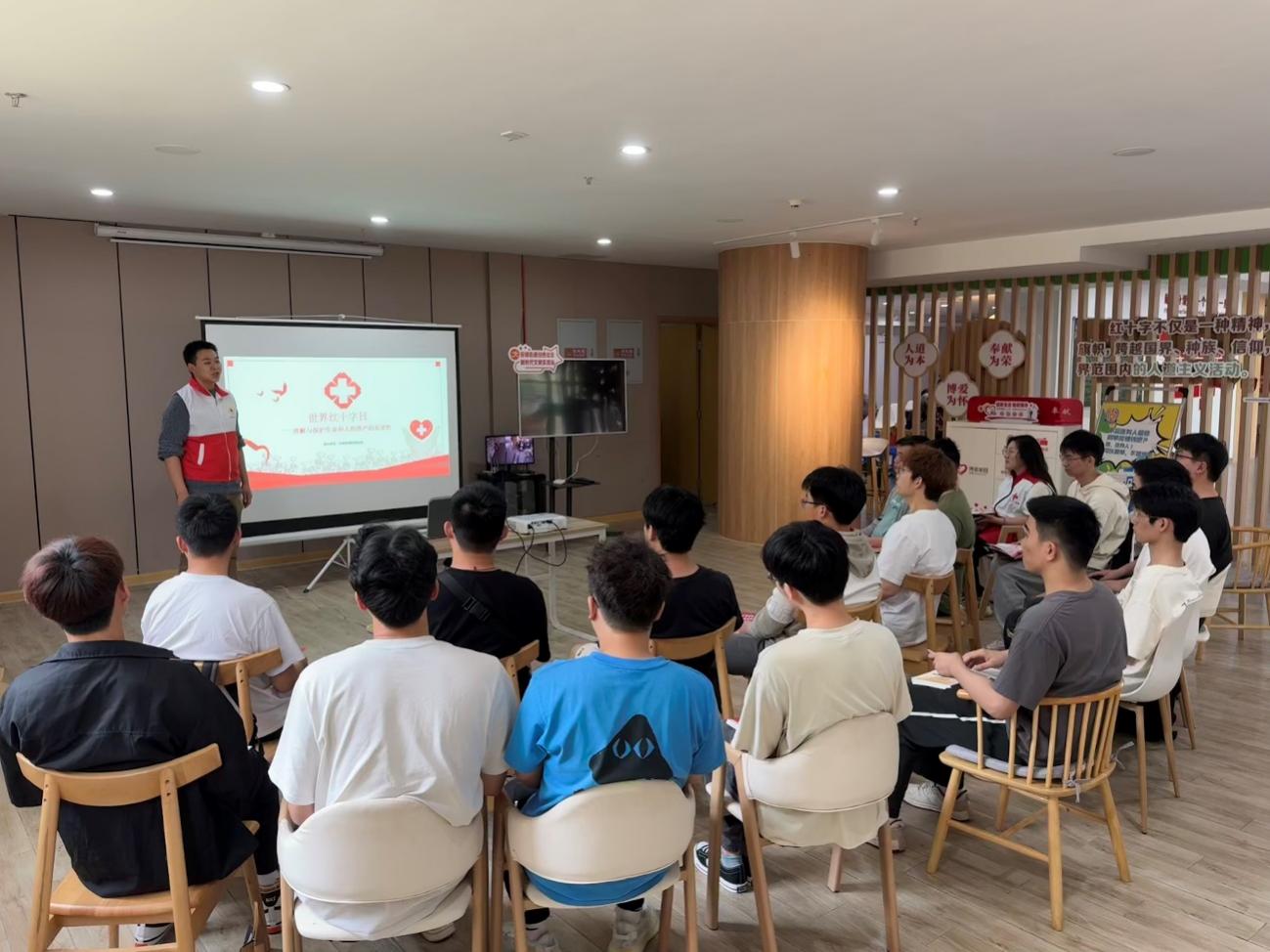活动当天,同学们带着精心准备的宣传资料等物品来到安西社区。现任安西社区挂职基层团组织副书记缪浩然同学在社区活动室开展了宣讲活动,他详细介绍了红十字会的历史、宗旨、任务和标志,并通过实例讲解了红十字会在灾难救援、人道救助、志愿服务等方面的贡献,宣传“人道、博爱、奉献”的红十字精神。讲座内容深入浅出,使居民们对红十字会有了更加全面和深入的了解。