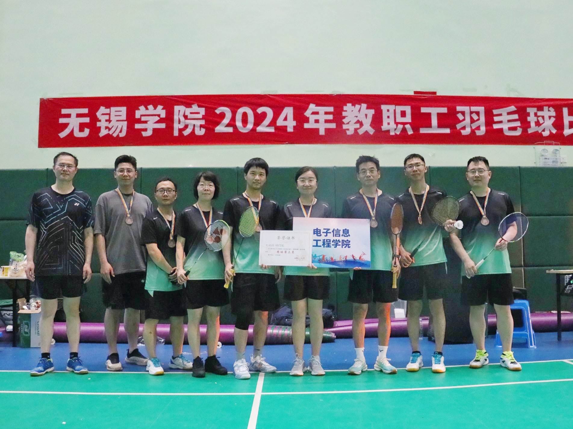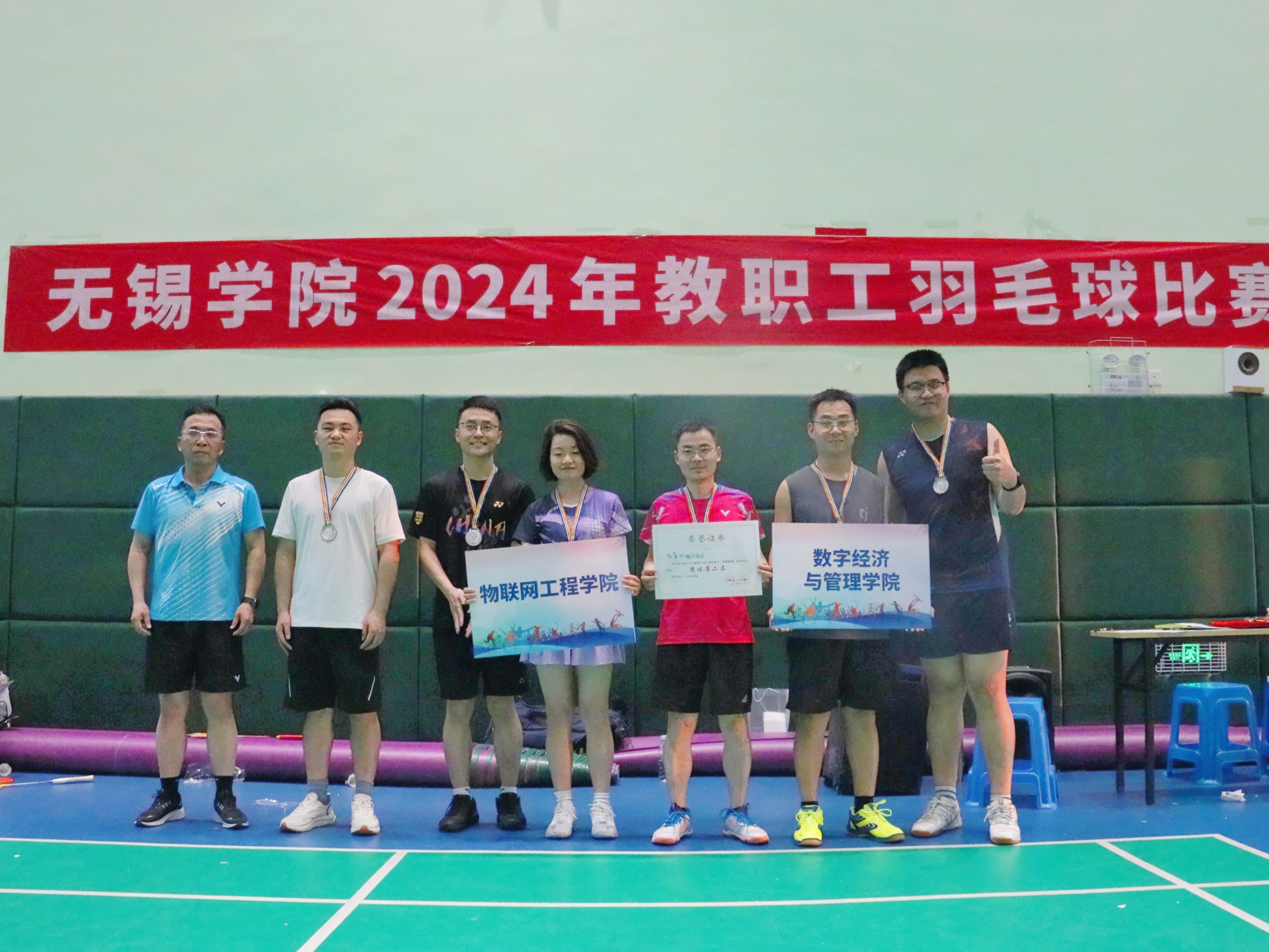 比赛现场气氛热烈而紧张,选手们精神抖擞,各显神通,他们或挥拍猛攻,或轻盈防守,展现出了高超的技艺和默契的配合。观众们也热情高涨,纷纷为选手们摇旗呐喊、加油助威。经过两天的激烈角逐,最终机关一队勇夺冠军,数字经济与管理学院和物联网工程学院联队获得亚军,电子信息工程学院一队获得季军,自动化学院一队、大气与遥感学院、机关二队分别获得第4、5、6名。赛场上的精彩表现充分体现了我校教职工良好的精神风貌和团队合作精神,很好地彰显出校园文化的独特魅力。