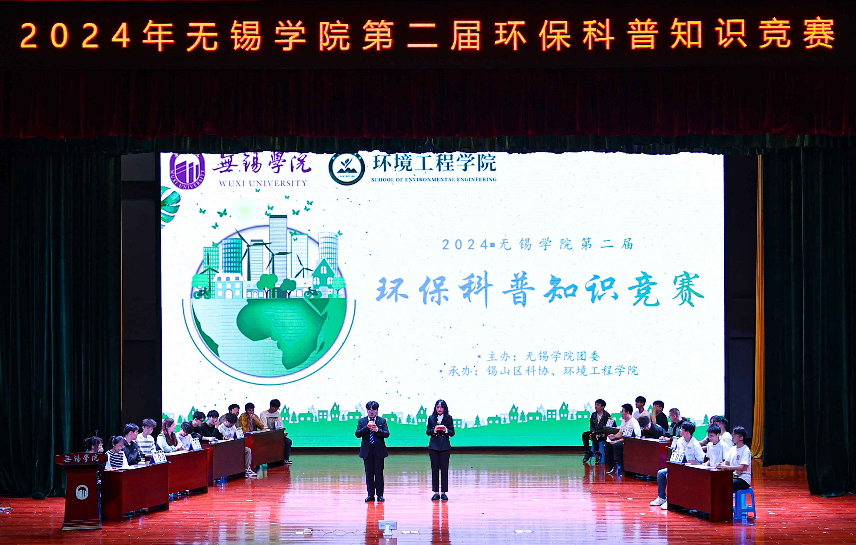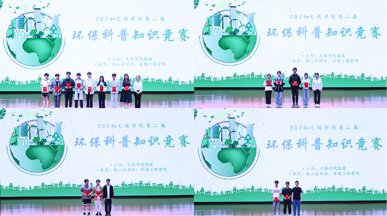 为贯彻落实习近平总书记在二十大报告中提出的推动绿色发展、促进人与自然和谐共生的理念,提升大学生的环保意识。5月31日晚,由我校团委主办,锡山区科协、环境工程学院承办的“无锡学院第二届环保科普知识竞赛”在大礼堂成功举办。环境工程学院党总支副书记姜欢,学办主任马丽娜,系主任李海玉,校团委创新实践部副部长吴征开出席并指导本场比赛。全校共32位参赛选手参加。