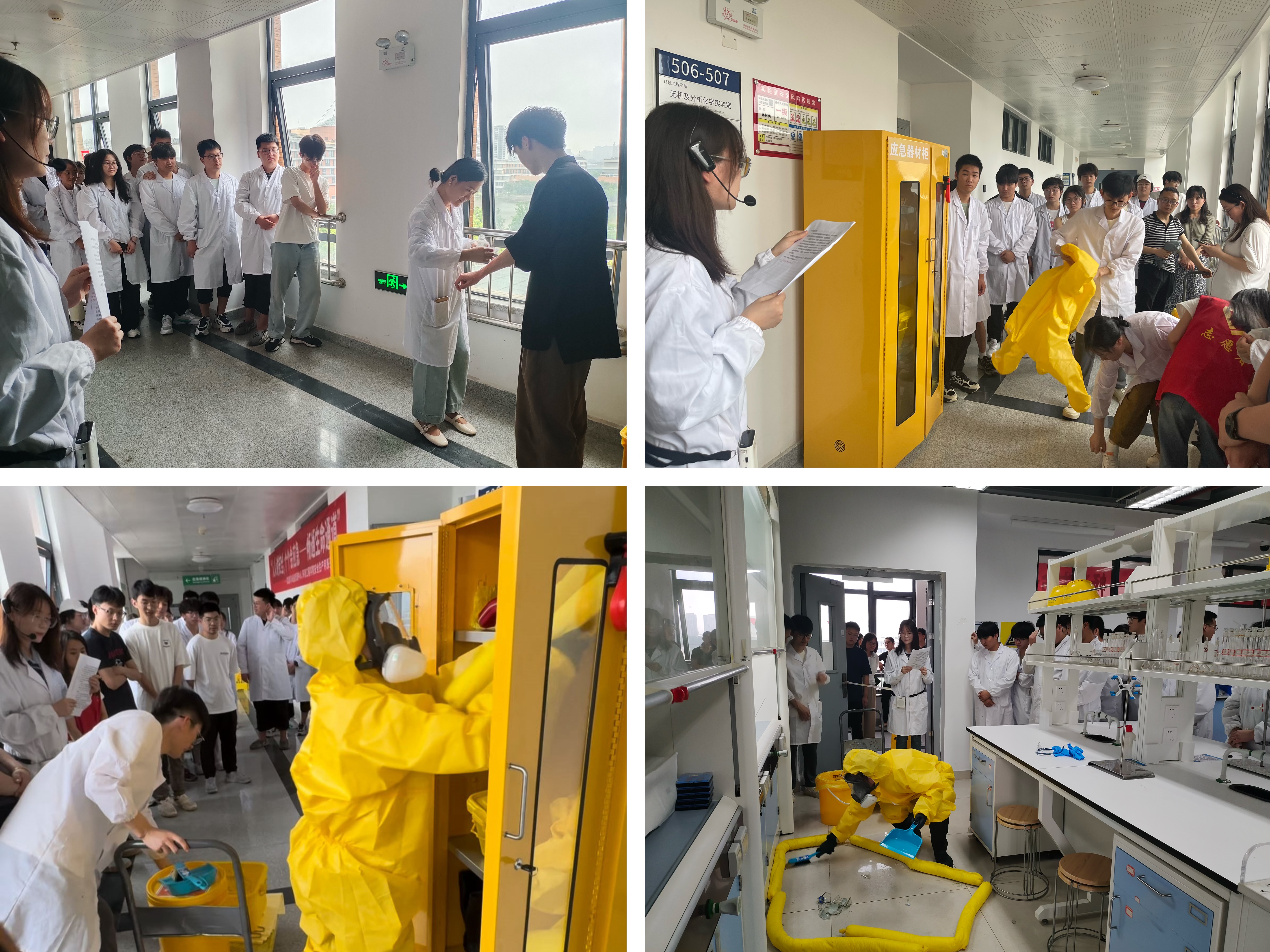 本次演练针对由于学生操作不当,实验过程中突发硫酸液体洒落,迅速启动实验室应急预案的情况进行实操。演练包括危化品泄漏发生后的紧急救护、人员疏散、事故逐级上报、警戒封锁、现场处理、善后恢复等应急处置环节。演练过程中,师生紧密配合、迅速撤离,各职能部门快速响应、有序处置,学生得到了紧急救护,泼洒的危化品得到了有效处理。演练现场,通过专业老师的演示,配合实时解说,参演师生对于应急喷淋与洗眼装置的使用、防护设备的穿戴规范和危化品泄漏的正确处理有了更加直观的认识。