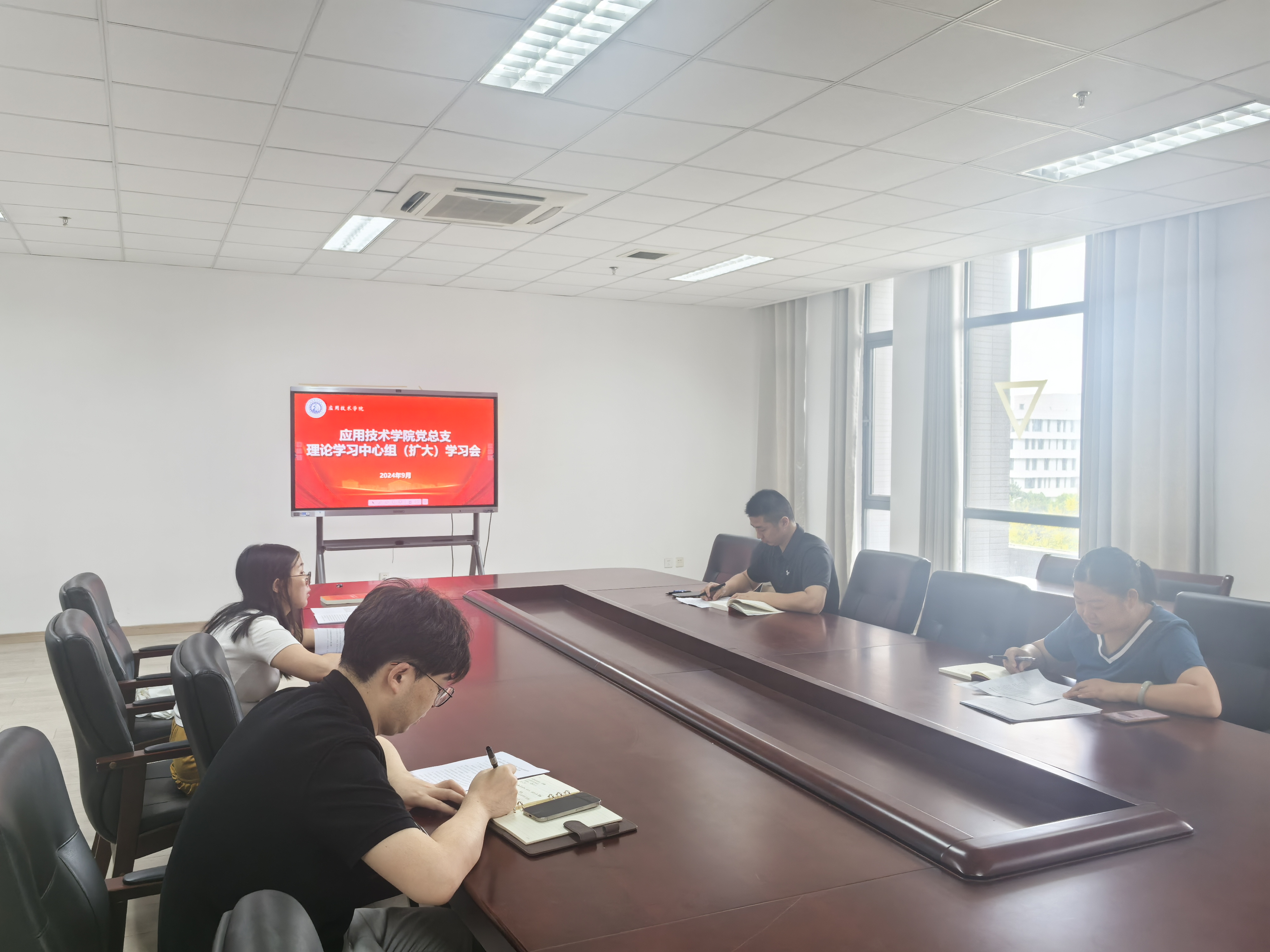 9月3日上午,应用技术学院党总支于思泉楼506会议室召开理论学习中心组(扩大)学习会,学院全体教师党员参会学习。会议由院党总支副书记张伏青主持。