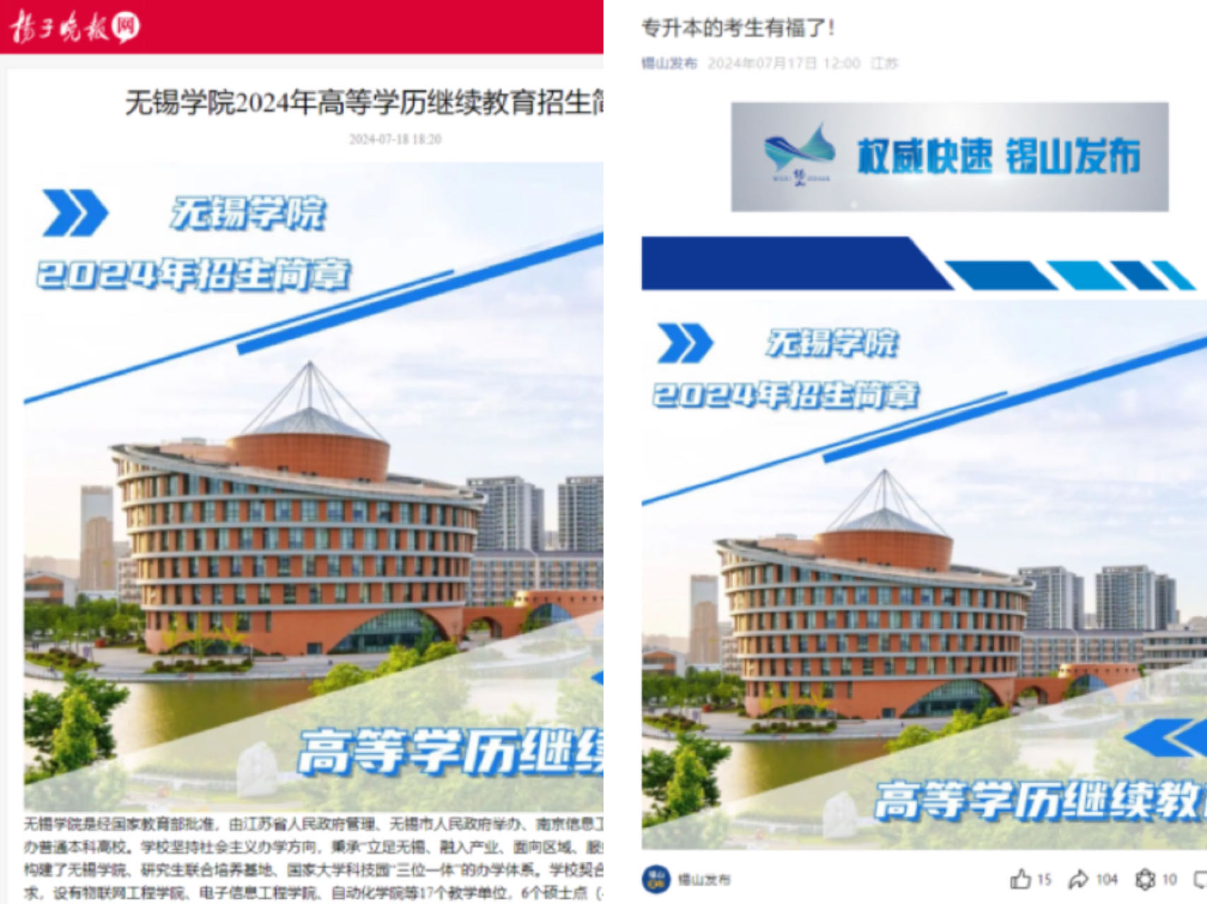 近期,我校高等学历继续教育工作的消息动态一经发布,便引起了社会的广泛关注,“扬子晚报”“锡山发布”等众多公众号纷纷进行转发报道。这些社会媒体的关注,不仅为我校高等学历继续教育带来了更高的知名度,也为广大考生提供了了解我校优质教育资源的渠道。