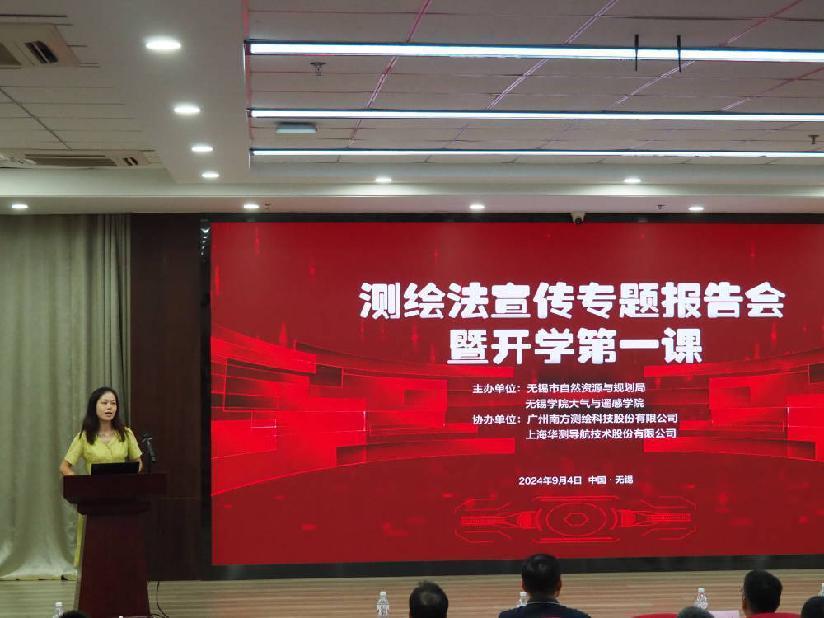 为提升大学生国家版图意识、倡导规范使用标准地图、切实维护国家版图尊严,了解前沿遥感技术在地质灾害监测预警中的应用,9月4日 ,由无锡市自然资源和规划局、大气与遥感学院主办,广州南方测绘科技股份有限公司,上海华测导航技术股份有限公司协办的测绘法宣传专题报告会暨开学第一课校园活动在我校举办。无锡市自然资源和规划局副局长陈艳,广州南方测绘科技股份有限公司江苏区域经理龚镇国,上海华测导航技术股份有限公司江苏区域经理蔡鹏,我校党委副书记匡辉出席会议,大气与遥感学院院长卢楚翰、教师代表、地遥系全体学生等参会。会议由学院党总支副书记范雪主持,