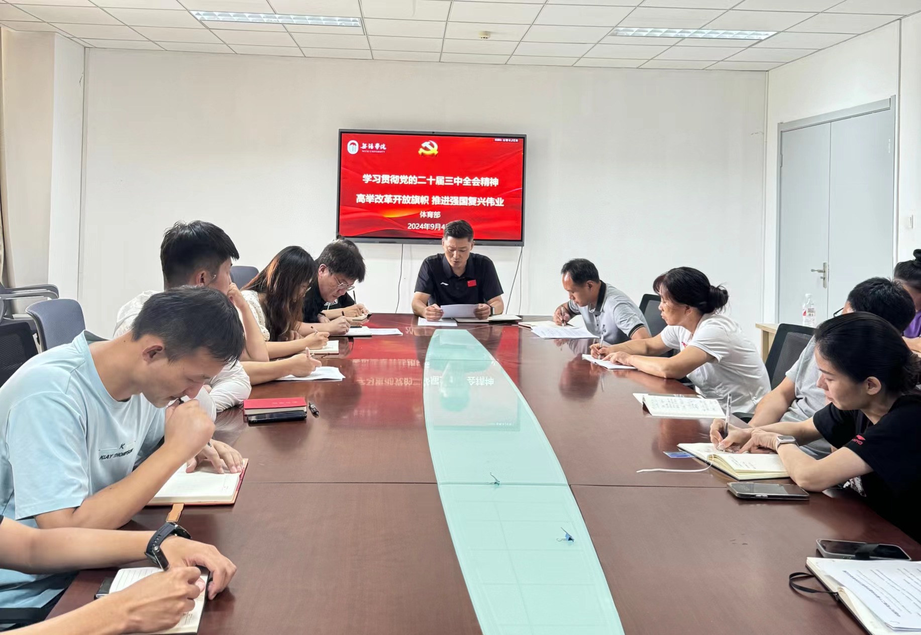为深刻领会党的二十届三中全会精神的丰富内涵和实践要求,进一步明确工作方向,9月4日,体育部党总支在体育馆204会议室召开党总支理论学习会议,学习传达党的二十届三中全会精神,全体党员参加会议。会议由党总支负责人宋巨华主持。