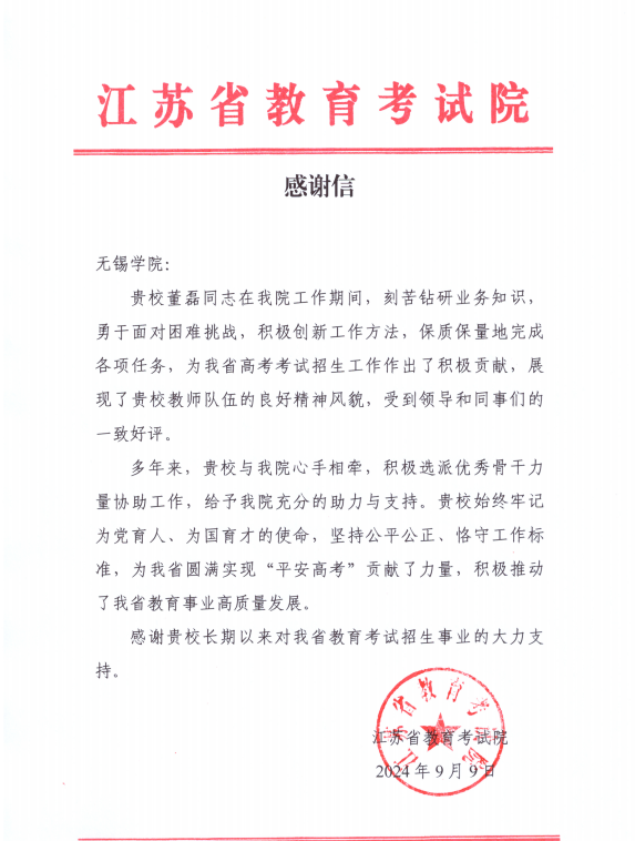 9月9日,江苏省教育考试院向我校发来感谢信,感谢我校委派董磊同志到省考试院支持招生工作。董磊同志在省考试院工作期间,充分发扬了我校教师队伍刻苦钻研、扎实工作、勇于创新的精神,保质保量地完成了各项任务,为我省高考考试招生工作作出了积极贡献,受到省考试院领导和同事们的一致好评。
