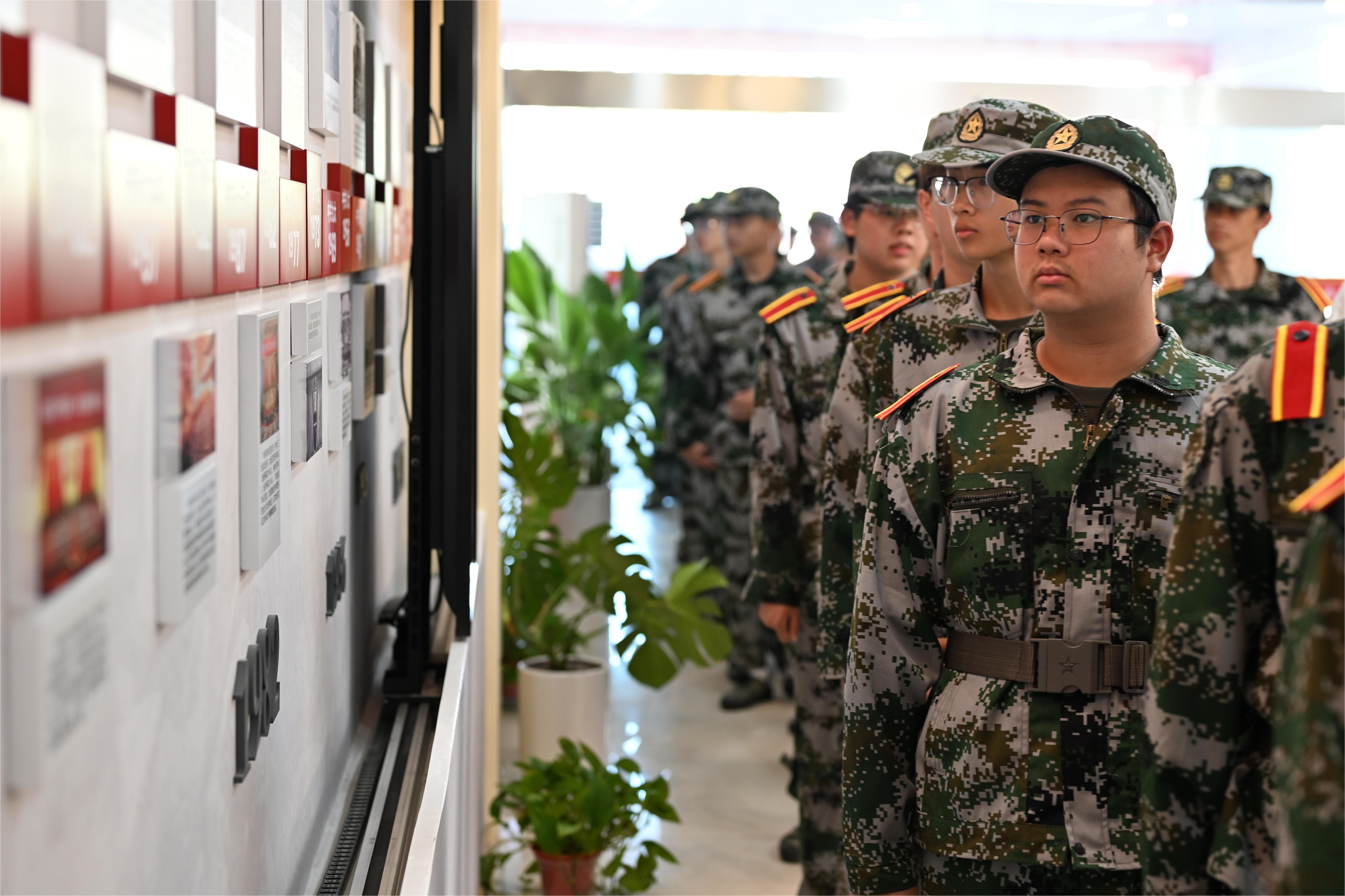 在第24个全民国防教育日来临之际,为将爱国主义教育和国防教育融入军训教育全过程,9月14日上午,我校3300余名新生在校兵役服务站进行参观学习,校武装部人员陪同参观,校兵役服务站“戎耀讲解团”全程讲解。