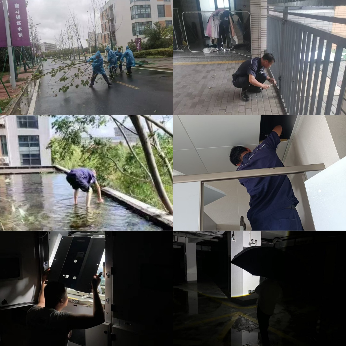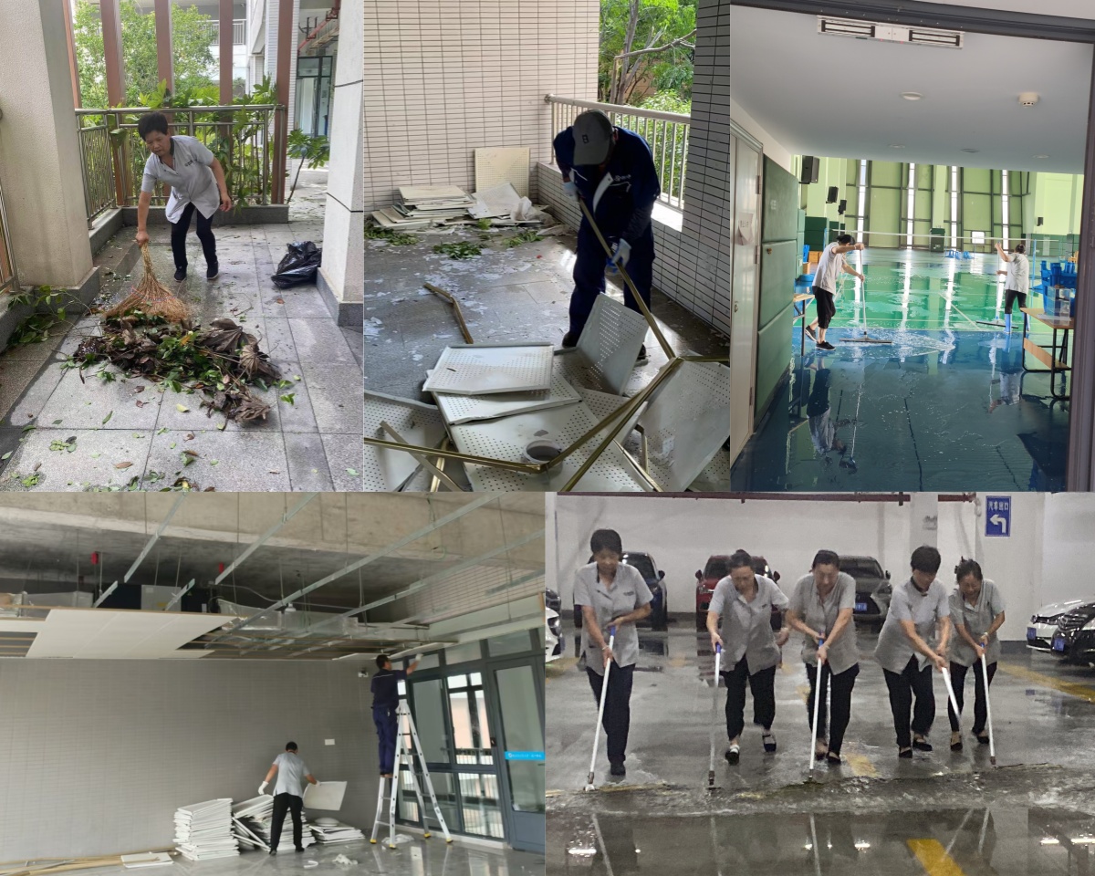 面对台风带来的破坏性影响,后勤管理处工作人员和校园物业单位员工在岗位上坚守并迅速响应:清理各类垃圾、扶起倒伏树木;疏通积水楼面;加固学生宿舍通道门等。