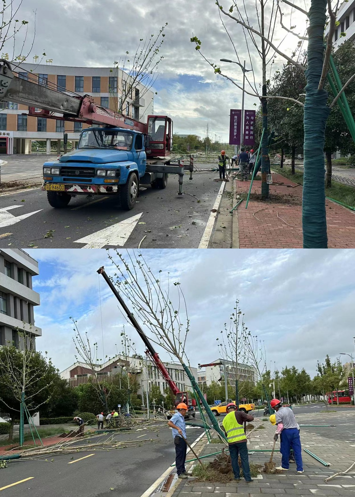 9月17日一早,后勤管理处工作人员带领校园物业单位全部员工开展清障工作。据不完全统计,受台风影响,全校约有270棵树木倒伏、断裂。后勤管理处及时联系抽调绿化工50余人,将校园主干道、主要通道口的倒地树木全部扶起、再栽种,全力保障全校师生通行无障碍。