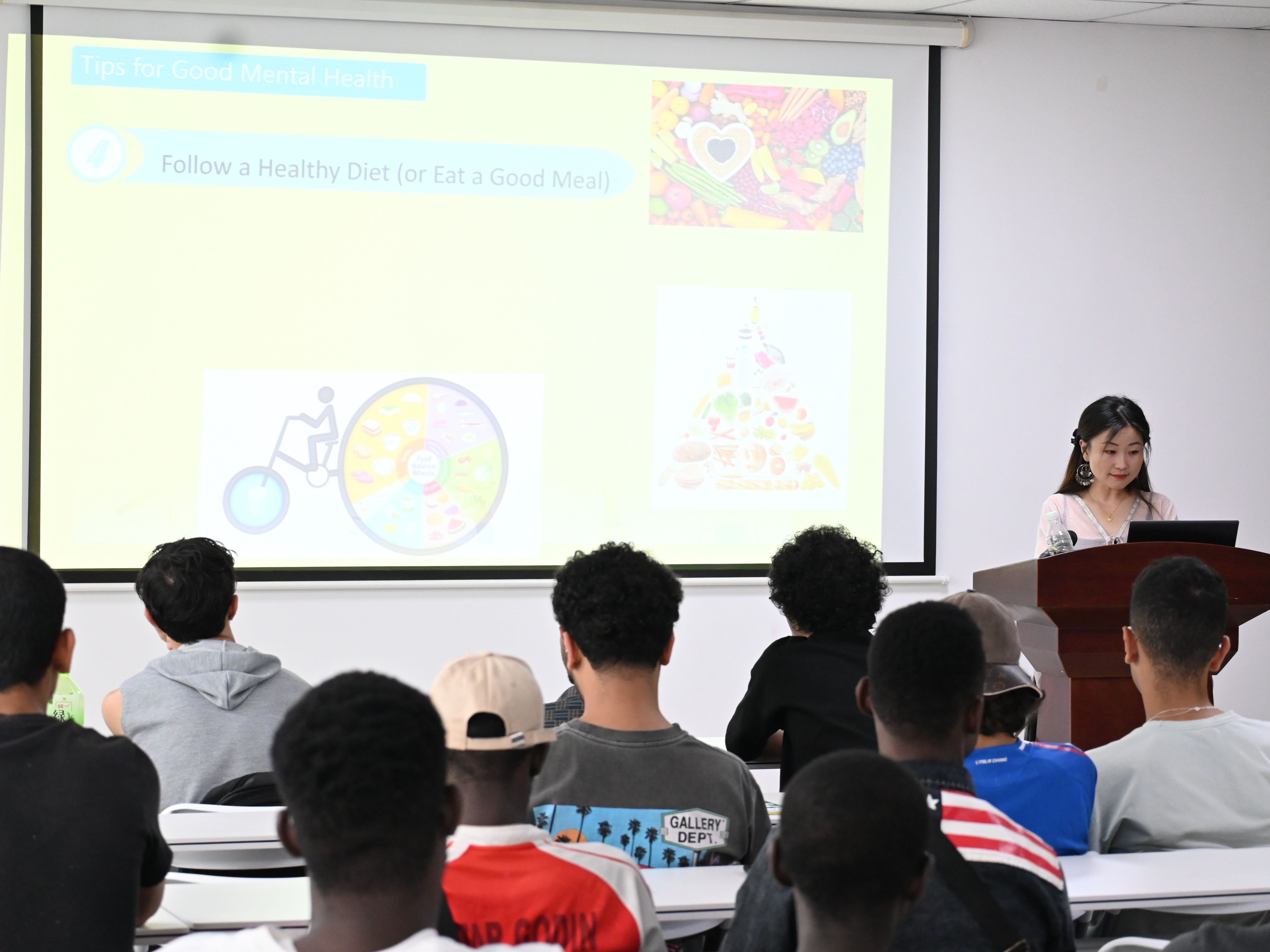 活动现场,学生工作处吴安莲老师作《心理健康与自我调适》英文讲座,介绍了心理健康的基本知识、留学生常见心理问题、问题表现及如何应对等内容,并现场带领留学生们一起练习腹式呼吸、静坐冥想等心理调节实用技术。讲座结束后,吴老师带领留学生们开展了团体减压活动,用破冰游戏、鼓圈、心理舞蹈、团队游戏等形式,帮助大家在情绪表达、身体舞动和交流互动中获得身心整合与心理调整。