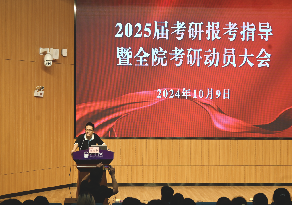 姜欢做总结讲话。他强调学院对考研工作十分重视,并承诺学院将一如既往地为考研学生提供全方位的支持和服务。他鼓励同学们保持积极的心态,坚持到底,争取在2025年的研究生考试中取得优异成绩。