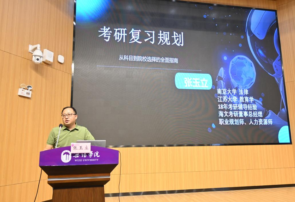 学院特别邀请了朱佳鸣和张玉立两位考研指导老师来为同学们做详细的考研指导。朱佳鸣从报名注意事项、调剂、现阶段各学科复习规划等方面为现场学生提供冲刺备考指导;张玉立就考研流程、时间安排、科目选择、英语复习等方面进行了深入讲解,为学生提供了从科目到院校选择的全面指导。