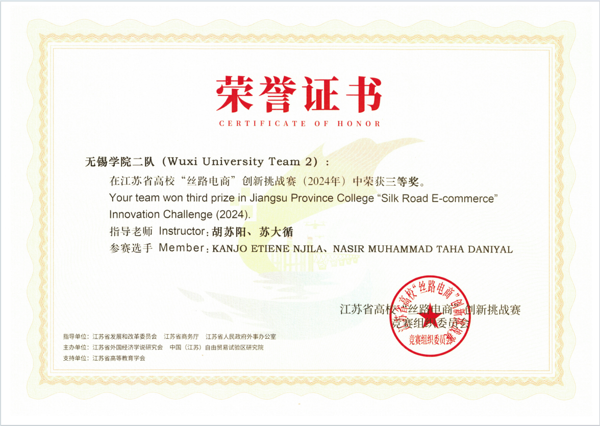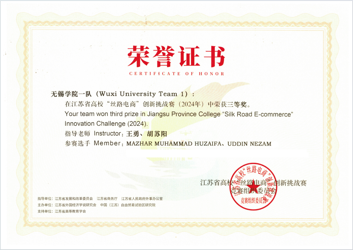 2024年10月26日,第一届江苏省高校“丝路电商”创新挑战赛总决赛在南京大学苏州校区举办。经过激烈的角逐,国际教育学院MAZHAR MUHAMMAD HUZAIFA、UDDIN NEZAM、KANJO ETIENE NJILA、NASIR MUHAMMAD TAHA DANIYAL四位同学组成的两支无锡学院留学生代表队在初赛中进入排名前列,并在决赛中获留学生赛道三等奖2项。此外,我校还荣获江苏高校“丝路电商”创新挑战赛组织委员会颁发的优秀组织奖。我校来自马来西亚的2023届数字媒体艺术专业本科留学生校友谢馨(SEAH XIN)、周可怡(CHEW ZHI TONG)在南京大学就读研究生,在本次省丝路电商总决赛中荣获一等奖。