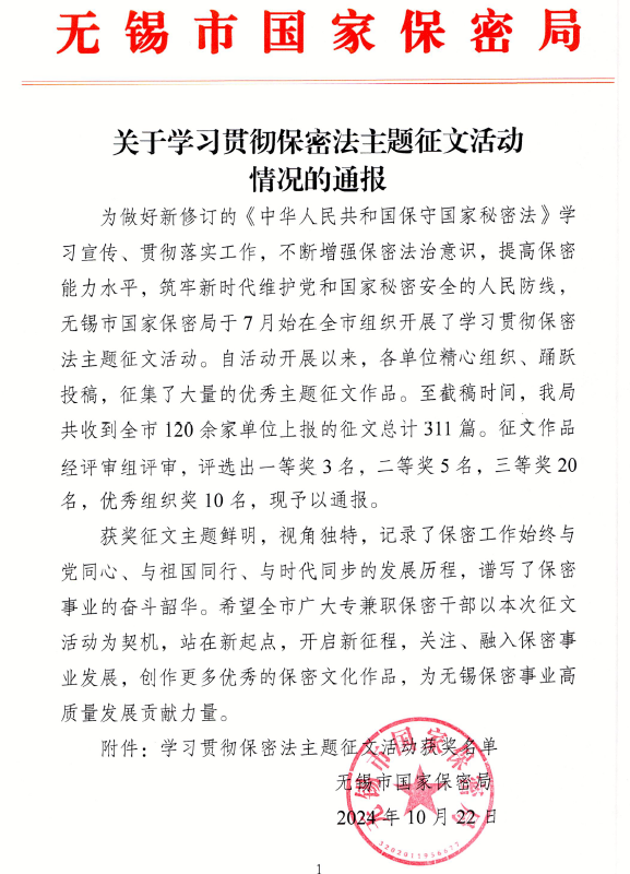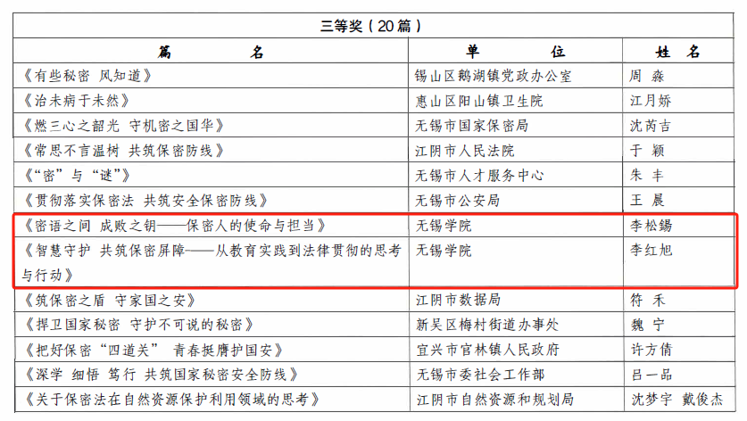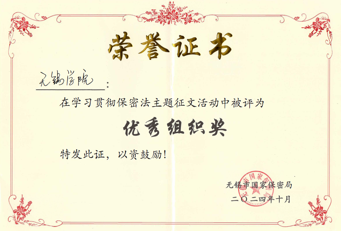 近日,在无锡市国家保密局组织开展的学习贯彻保密法主题征文评选活动中,我校荣获优秀组织奖。本次活动由无锡市国家保密局主办,全市120余家单位参加,共征文311篇,评选出一等奖3名,二等奖5名,三等奖20名,优秀组织奖10名。无锡学院是全市唯一一所荣获优秀组织奖的学校。我校电子信息工程学院(集成电路科学与工程学院)李红旭老师、马克思主义学院(法学院)李松鍚同学荣获个人三等奖。