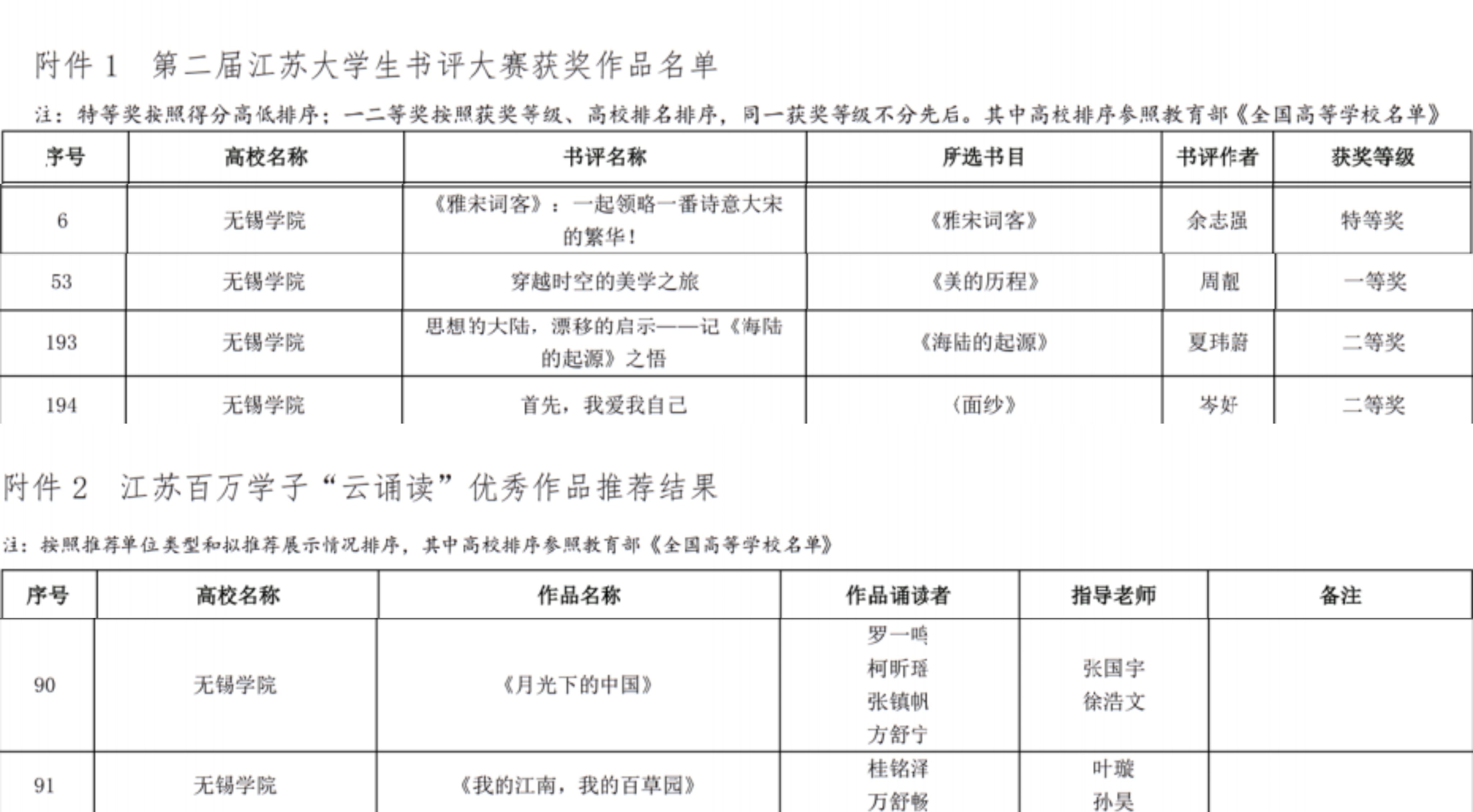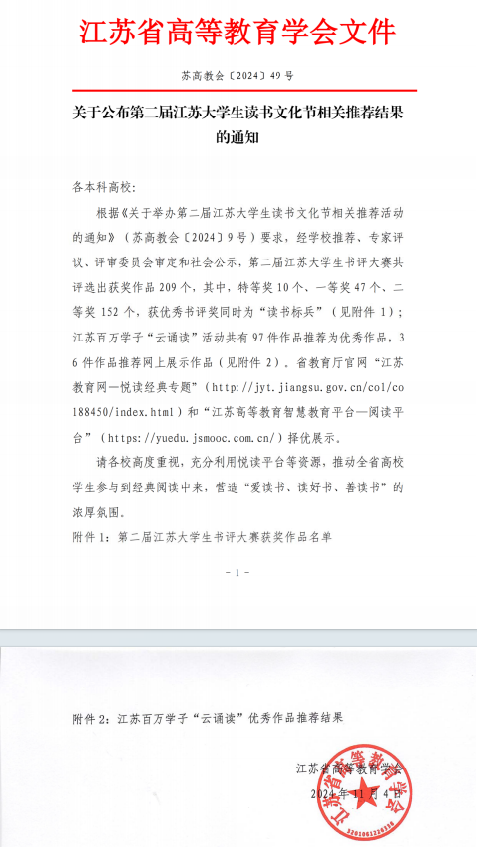 近日,由江苏省教育厅主办、江苏省高等教育学会协办的第二届江苏大学生读书文化节系列活动评选结果揭晓,我校学子共斩获6项奖项。