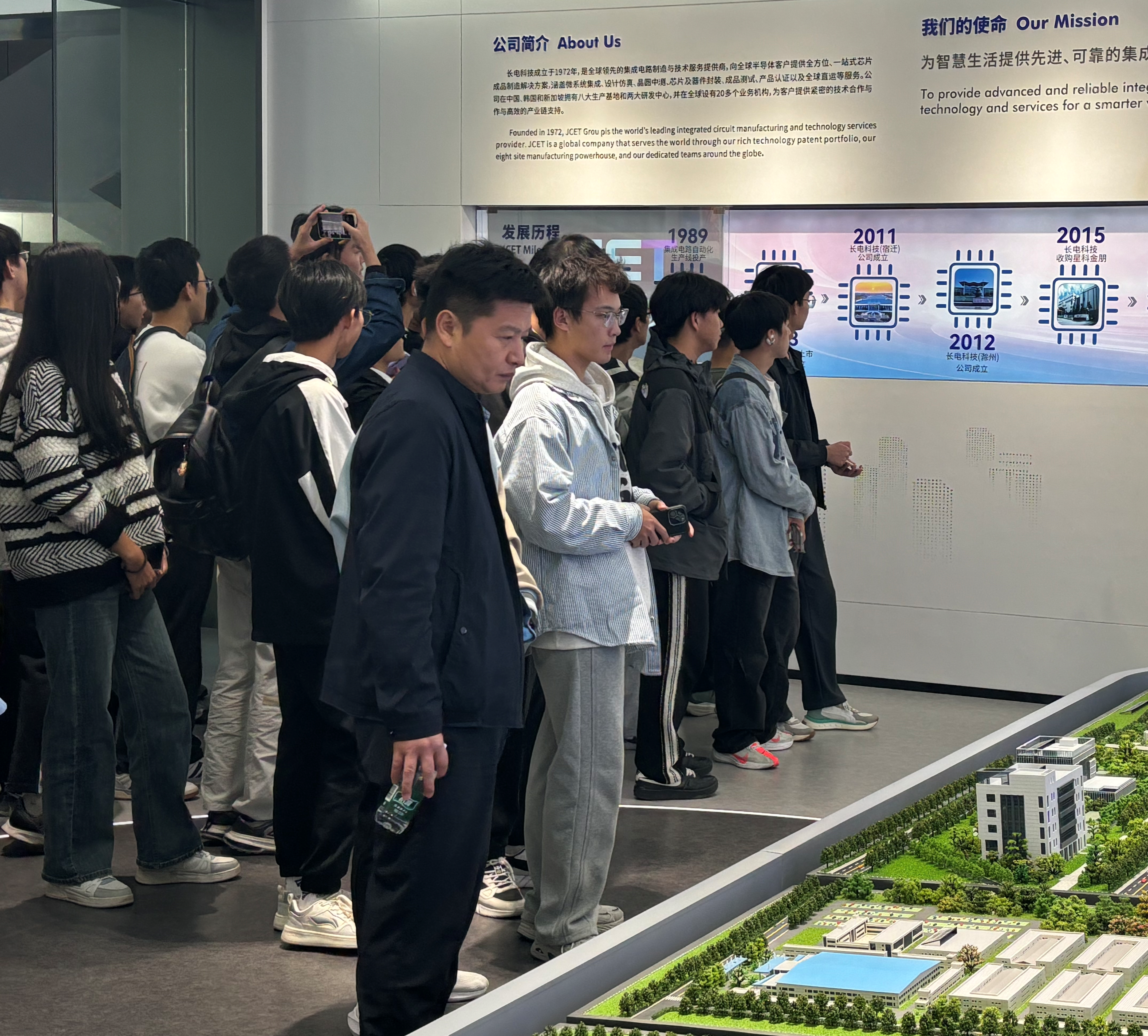 参观中,同学们在讲解员的带领下,首先参观了长电科技的展厅,深入了解了企业文化和企业智能化发展状况,贴近行业一线,了解集成电路封测行业的各种封装技术和产品,接着,同学们了解到封测厂房的各种现代化设备,以及先进的封测工艺和技术,对这些高新技术设施的运作原理和生产流程有了更直观的了解。此外,大家还一同参观封测博物馆。馆内展陈设计巧妙,将科普知识与现代科技完美融合,时光隧道穿越时空,实景模型直观展示生产流程,电子屏幕动态演绎技术变迁、VR体验等一系列多元化的展示方式让同学们身临其境,感受科技带来的震撼,全面系统地了解了封测产业的发展历史、技术变迁、产业链布局及产品应用,更激发了他们对科学的浓厚兴趣,感受科技的力量与魅力。