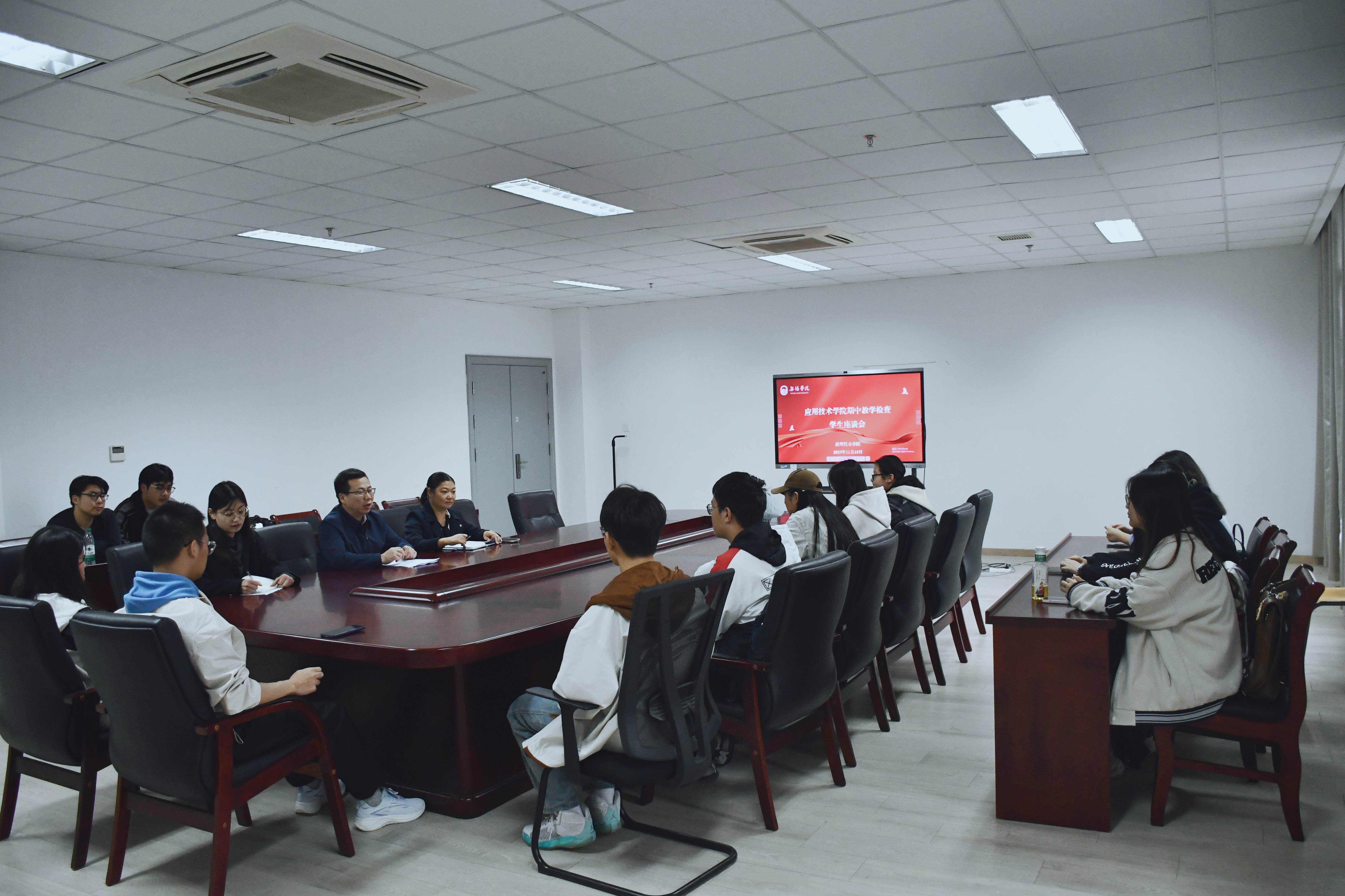 11月15日下午,应用技术学院在思泉楼506召开了2024-2025年第一学期期中教学检查学生座谈会。院长齐运锋,副院长武丽,教学秘书和学生代表参加了座谈会,江南大学副教授顾德作为督导受邀参会。会议由武丽主持。