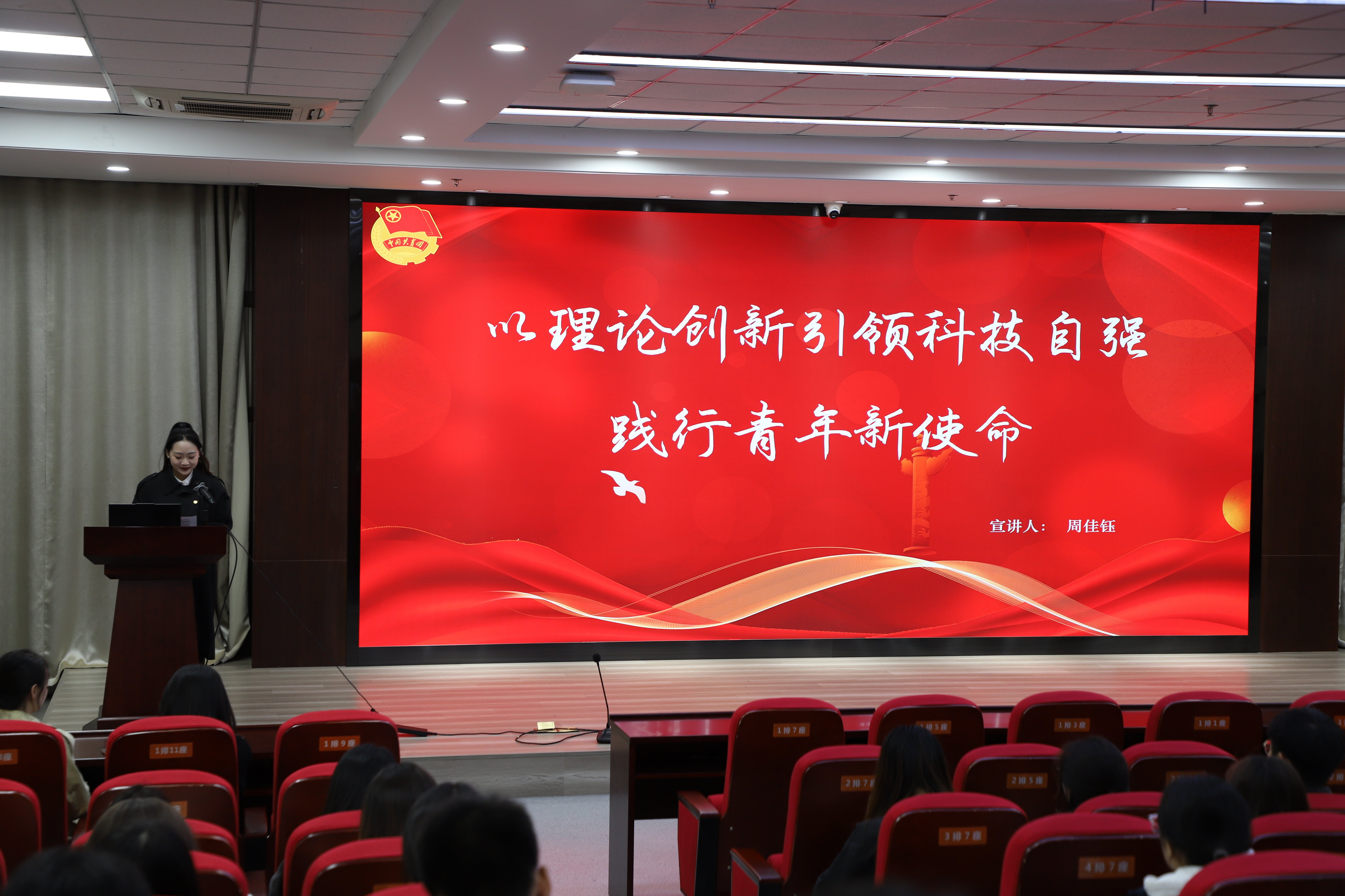 周佳钰分享“以理论创新引领科技自强,践行青年新使命”主题微团课,阐述了新时代青年加强党的创新理论学习的重要性,并立足我校学子实践经历,号召同学们要以青春热血投身创新实践,在党的创新理论的指引下抓住机遇、应对挑战,不断塑造发展新动能、新优势,强化国家战略科技力量,自觉承担起党和人民赋予青年的时代使命。