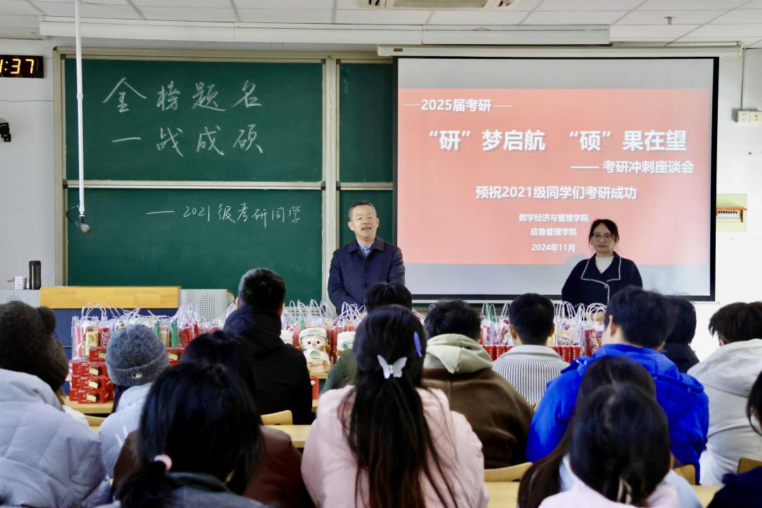 在2025年全国硕士研究生招生考试即将到来之际,为给考研学子传递温暖和鼓励,坚定备考信心,调整备考状态,11月27日下午,数字经济与管理学院(应急管理学院)在尚美楼411教室开展了“‘研’梦启航,‘硕’果在望”2025届考研动员暨考研冲刺座谈会。学院院长刘军、学院党总支副书记李诗雅、毕业班辅导员和学院2025届考研学子参加了本次活动。活动由卢艳老师主持。