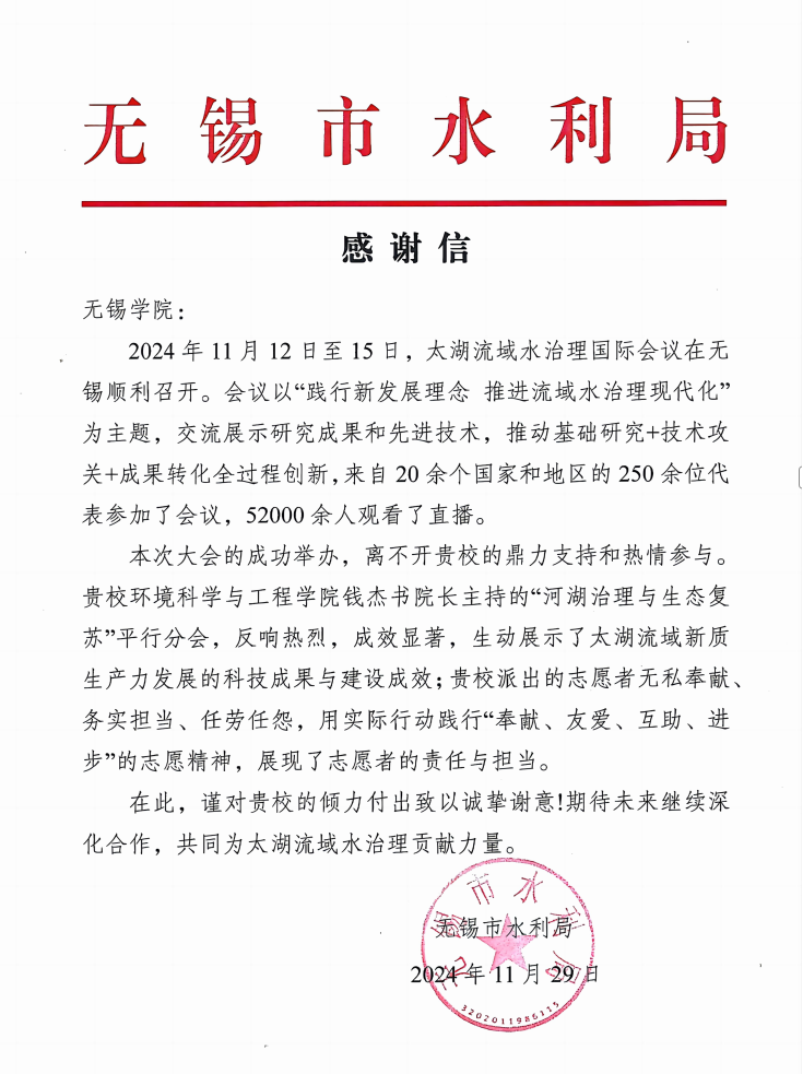 11月29日,无锡市水利局向我校发来感谢信,感谢我校在太湖流域水治理国际会议筹备工作中给予的积极支持与帮助。感谢信指出,无锡市于11月12日至15日成功举办了太湖流域水治理国际会议。此次盛会以“践行新发展理念,推进流域水治理现代化”为主题,期间,会议交流展示了最新的研究成果与先进技术,推动了基础研究、技术攻关与成果转化的全链条创新。来自20余个国家和地区的250余位代表参加了此次会议,52000余人通过直播观看了相关内容。