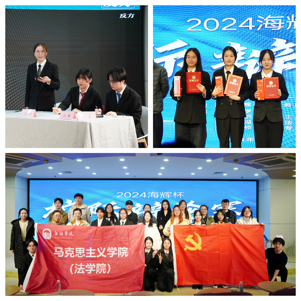 比赛采用两两对决的形式,经过多轮唇枪舌剑的激烈攻防,最终我校法学院一队和二队分别战胜江南大学、太湖学院团队,获得优胜奖。其中,24法学1班的赵关盛楠获得优秀辩手奖,她在比赛中表现突出,凭借出色的辩论技巧和深刻的观点赢得了评委和观众的一致好评。