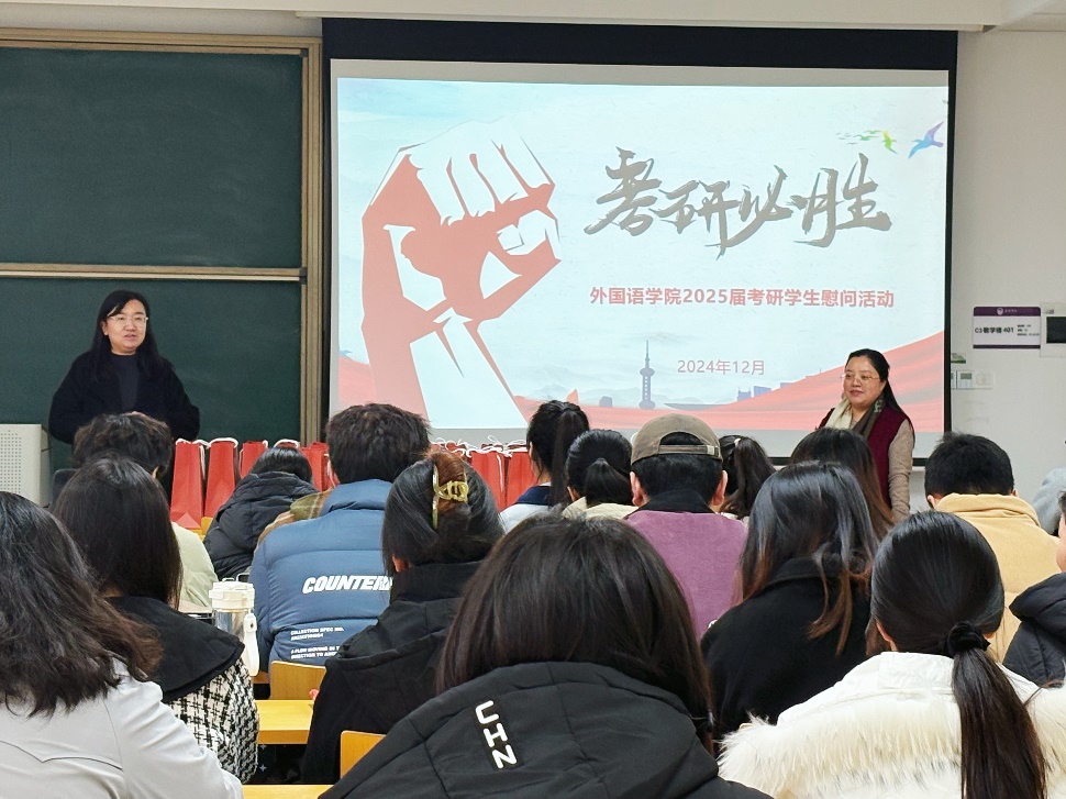 为鼓舞考研学子士气,舒缓备考压力,坚定冲刺信心,12月11日上午,公共基础教学部(外国语学院、大学生文化素质教育中心)于敏学楼401举办“研”途送温暖,助力考研梦2025届考研学子冲刺慰问活动。副主任赵岚、党总支副书记曹琳、各班班主任及相关老师出席活动。
