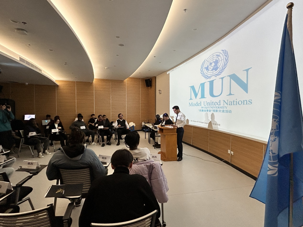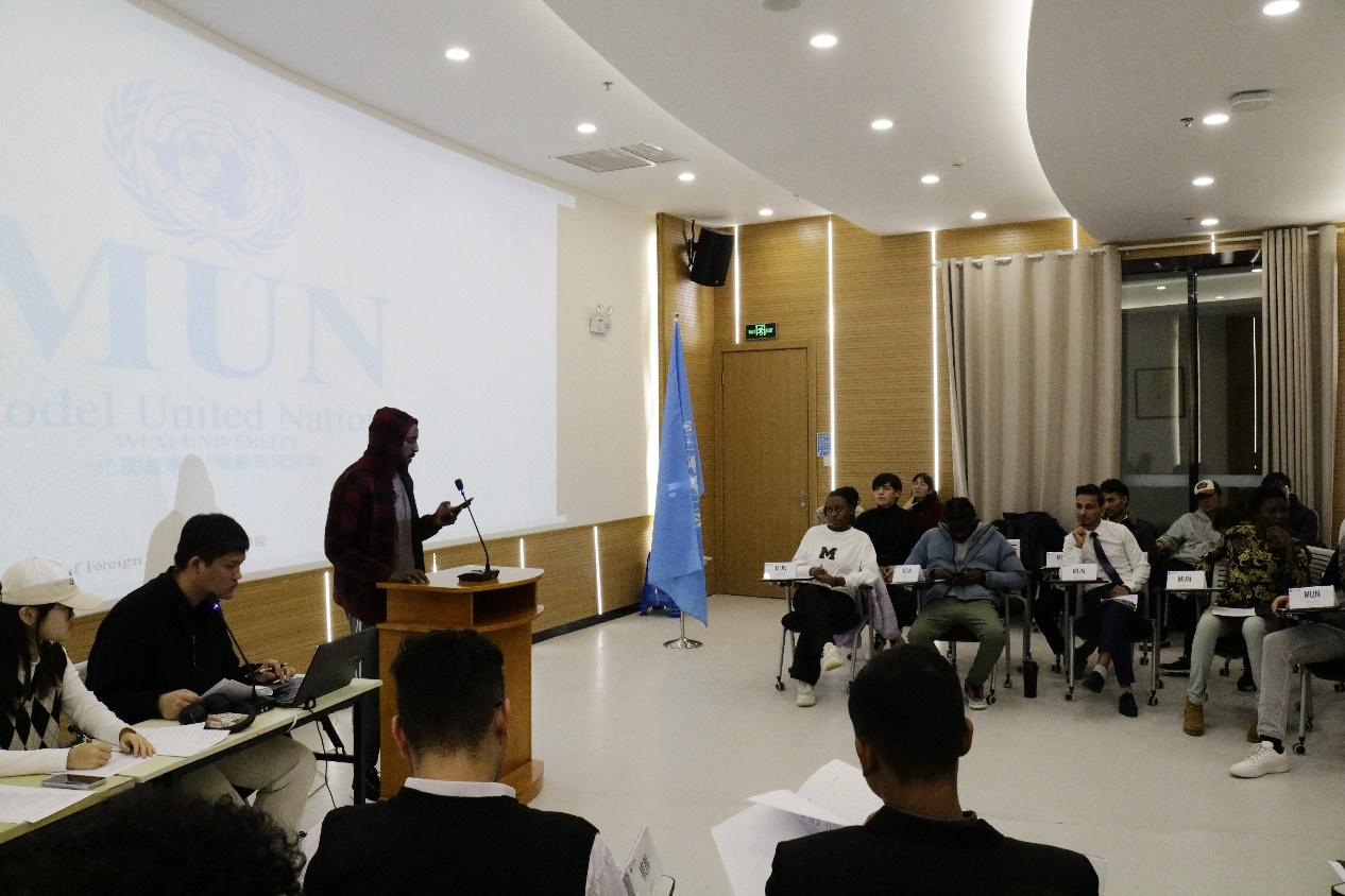 12月11日下午,我校首届模拟联合国大会(Model United Nations Conference)在图书馆视听艺术鉴赏空间成功举办。此次活动由国教院组织,来自中国、马来西亚、巴基斯坦、阿尔及利亚、印度、布基纳法索、利比里亚、津巴布韦、苏丹、摩洛哥、乌兹别克斯坦、加纳、埃及等17个国家的学生代表参会,围绕“国际护照平等通行”这一重要议题展开了激烈精彩的陈词辩论。