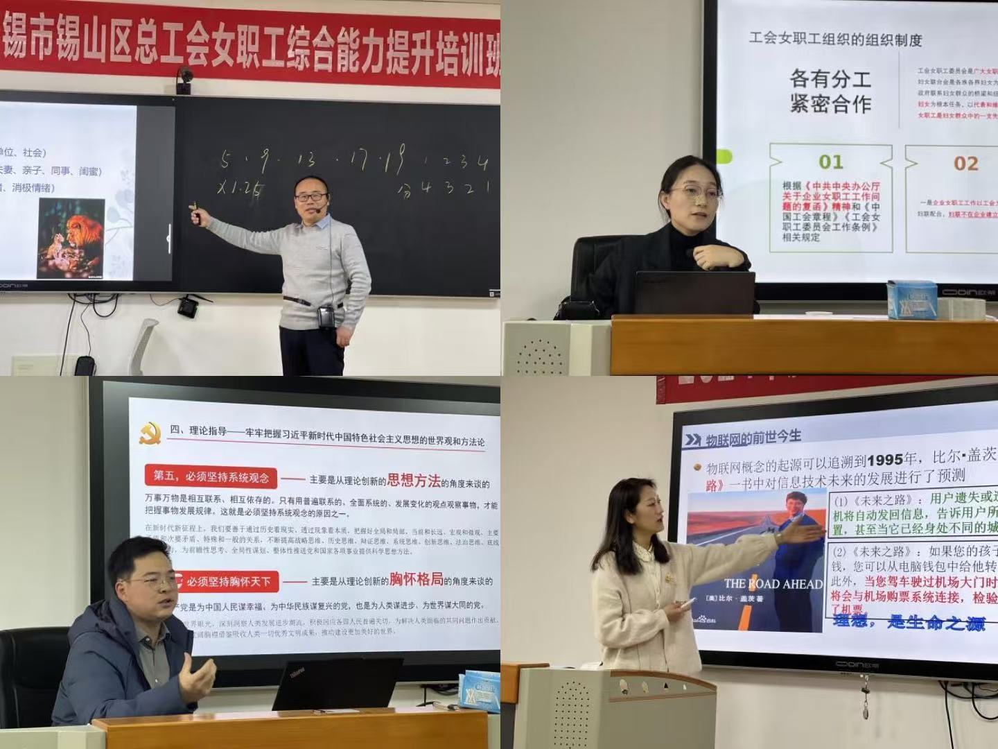 此次培训课程紧扣锡山区工会女职工职业发展的实际需求,充分发挥我校的教学与科研优势,邀请了无锡市总工会女工部部长庄婷、江苏省无锡技师学院学生工作处副处长韩仁美、我校物联网工程学院教授马丽、马克思主义学院讲师焦鑫等多位专家授课。培训内容涵盖党的二十大、二十届三中全会精神解读、女工工作实务、女性职工心理建设与自我提升、物联网技术基础与应用、国学文化与管理智慧、非遗纸刻等多个领域,理论与实际案例结合,课程内容生动、深入,学员们全身心投入学习,现场互动热烈,气氛活跃。学员们纷纷表示,培训不仅拓宽了视野,增强了业务能力,也提升了自身的综合素质和工作水平。他们表示将以此次培训为契机,立足岗位,勇于担当,充分将所学知识转化为实际工作成效,推动锡山区工会女职工工作不断发展与创新。