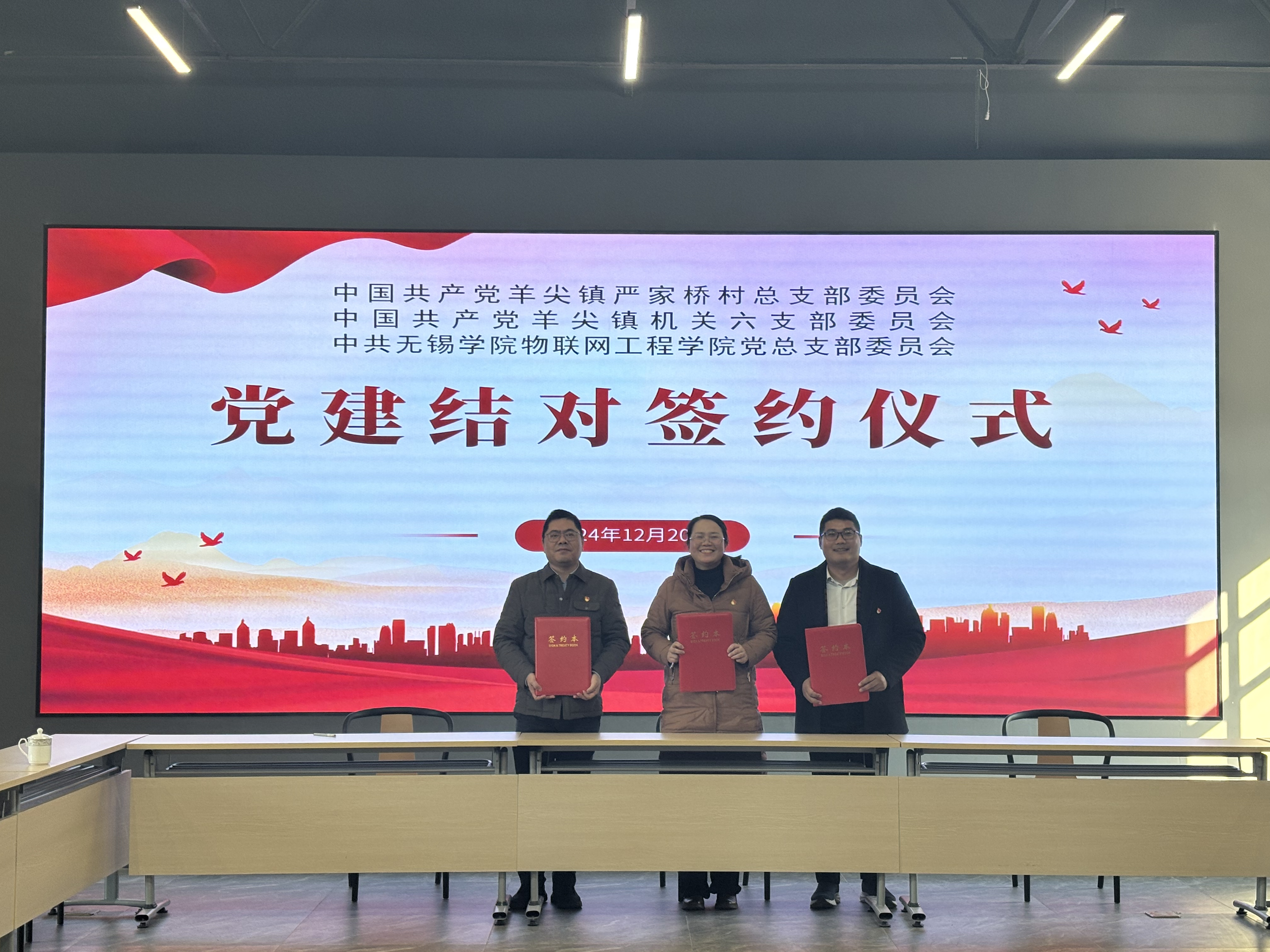 为进一步加强基层党组织建设,充分发挥党建引领作用,推动资源共享、优势互补、共同发展,12月20日下午,物联网工程学院党总支与羊尖镇严家桥村党总支、羊尖镇机关第六党支部在严家桥唐苑矩形粮仓举行了“踏寻红色足迹 共筑信仰之基”主题党日活动暨党建共建签约仪式。物联网工程学院全体教师党员及部分学生党员代表,共计50余人参加本次活动。