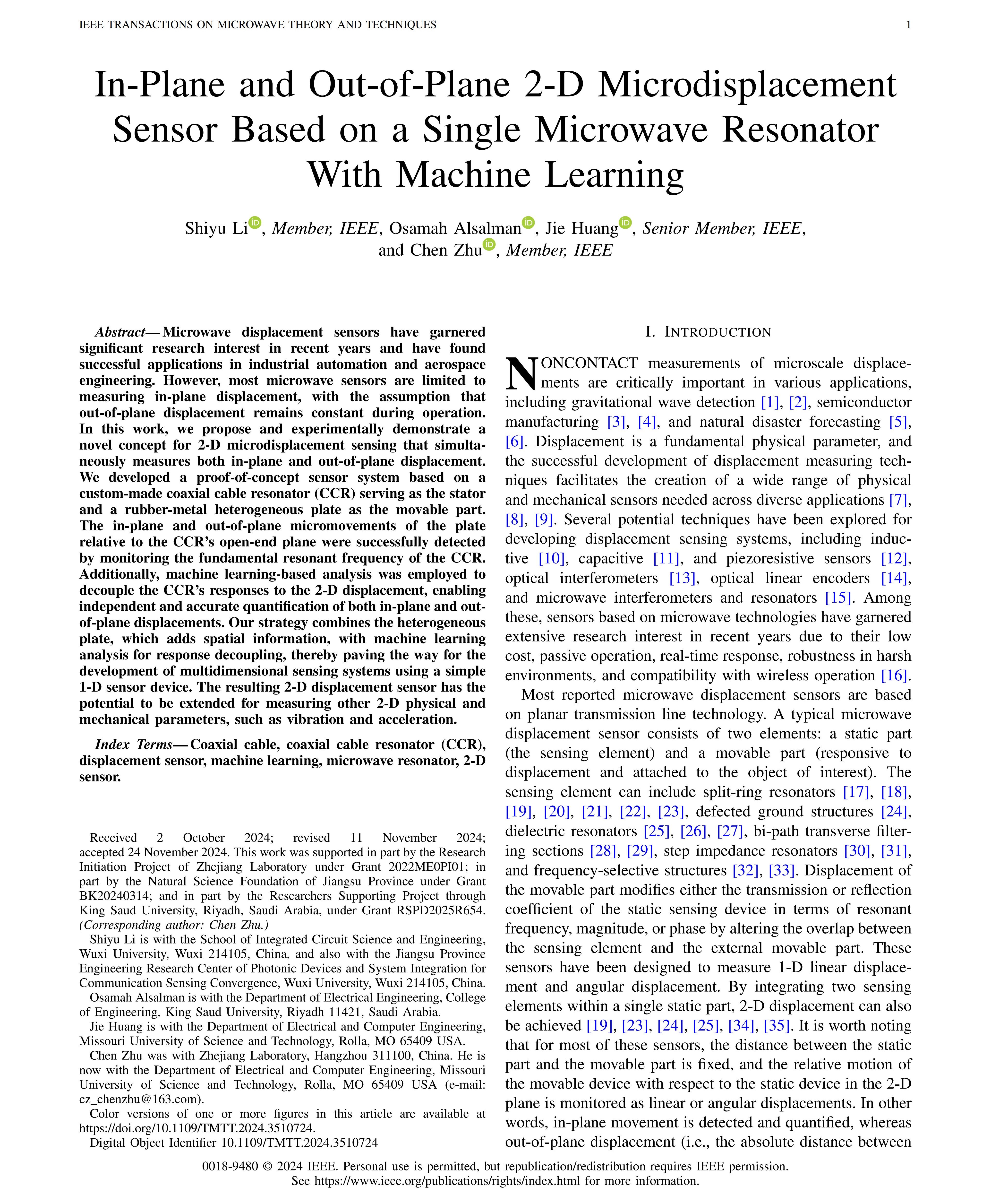 近日,我校集成电路科学与工程学院教师李世雨与密苏里科技大学等单位合作,在IEEE Transactions on Microwave Theory and Techniques上发表论文《In-Plane and Out-of-Plane 2-D Microdisplacement Sensor Based on a Single Microwave ResonatorWith Machine Learning》(原文链接:https://doi.org/10.1109/TMTT.2024.3510724),无锡学院为第一署名单位,李世雨为第一作者。IEEE Transactions on Microwave Theory and Techniques是微波、射频技术领域的国际顶级学术期刊,为中科院一区Top期刊。该项研究紧密贴合江苏省1650产业体系以及无锡市465现代产业体系中物联网先进产业集群的传感器技术领域,展开了深入研究。