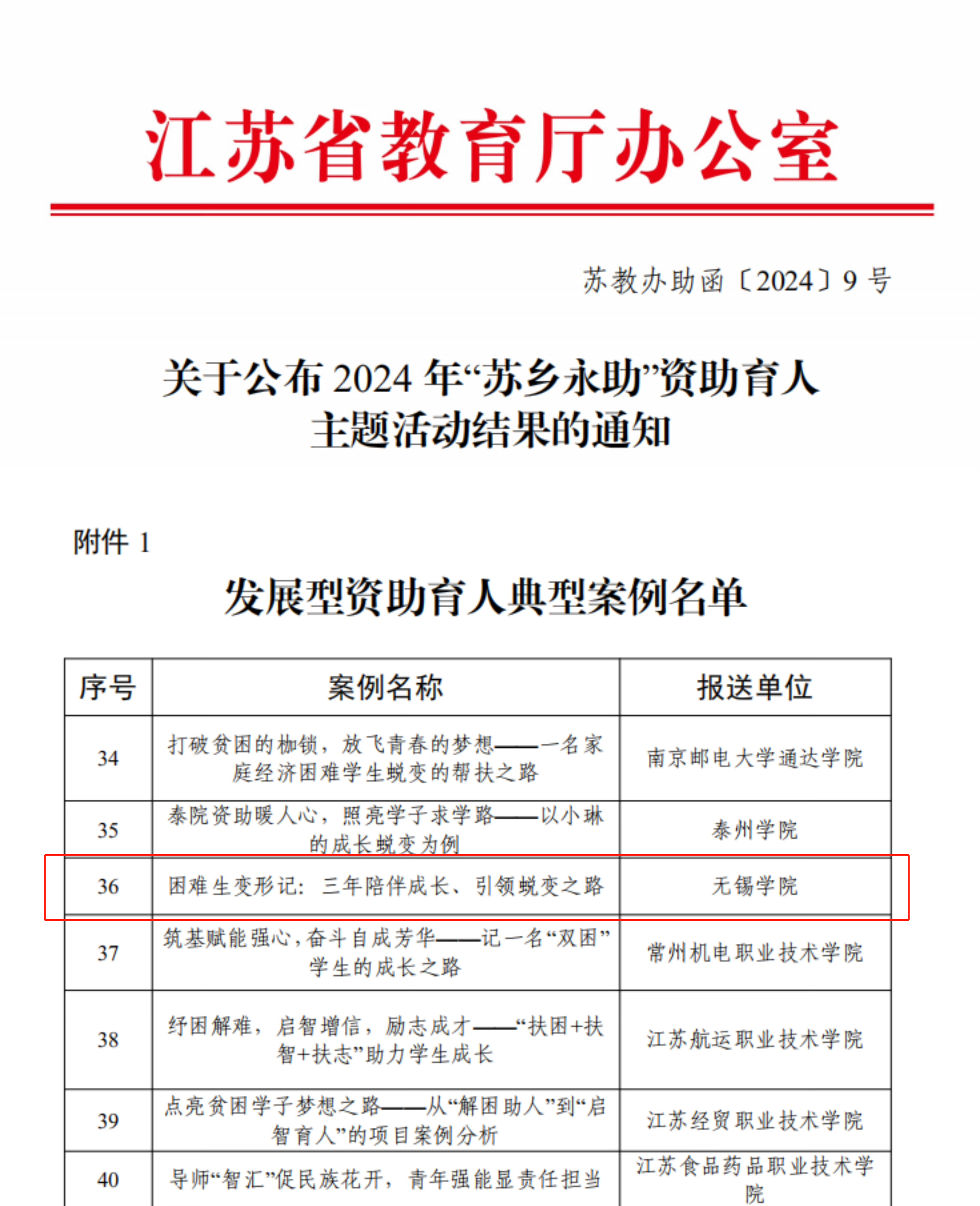 近日,江苏省教育厅揭晓了2024年“苏乡永助”资助育人主题活动的评选结果,我校喜获“江苏学生资助宣传大使”和发展型资助育人典型案例各一项。