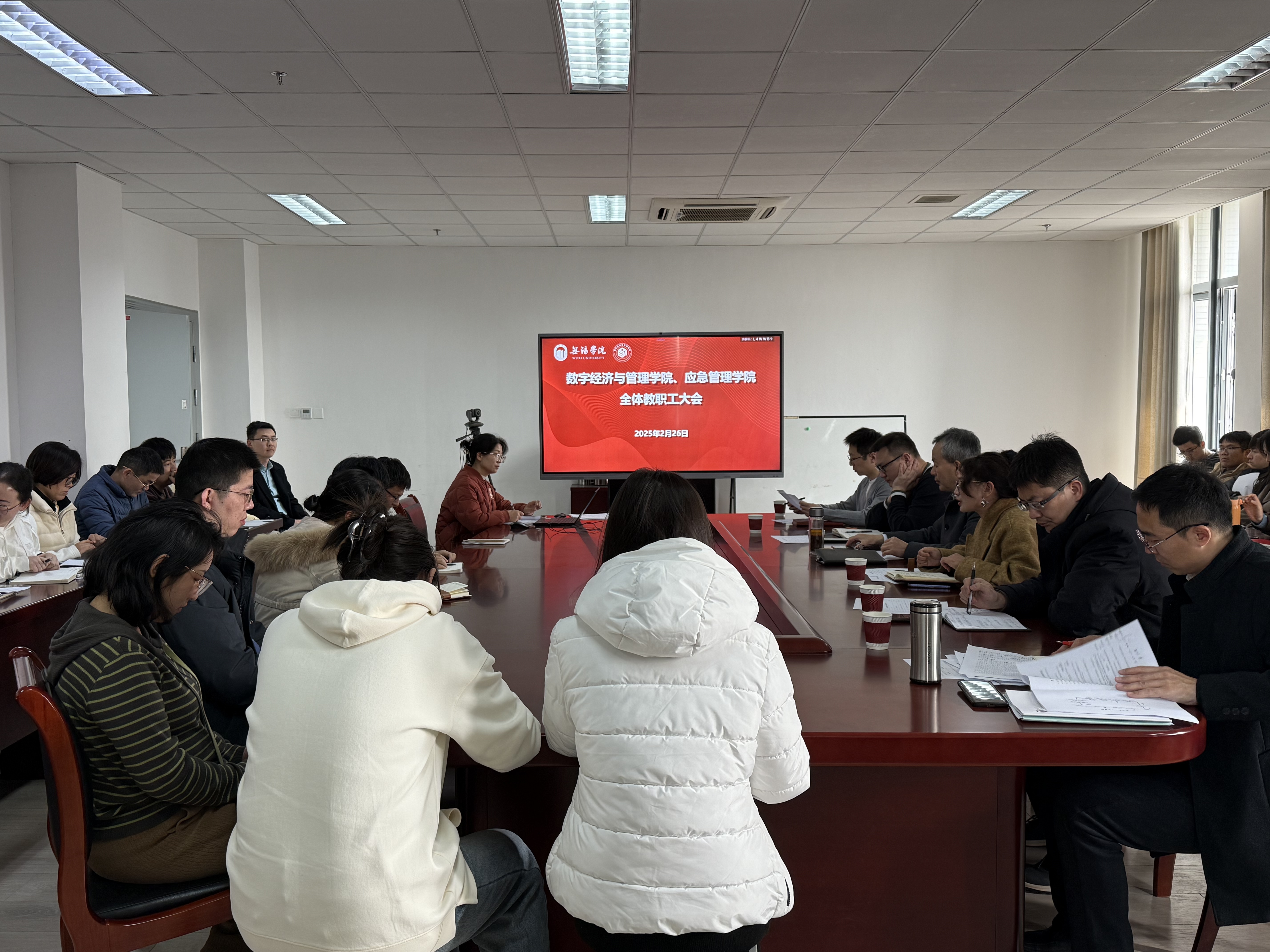 2月26日下午,数字经济与管理学院(应急管理学院)在尚美楼504会议室召开新学期全体教职工大会。院长刘军、党总支副书记李诗雅,数字经济与管理学院副院长王子敏,应急管理学院副院长邹衍华,数字经济与管理学院院长助理刘震、潘栋梁以及全体教职工参加大会。会议由李诗雅主持。