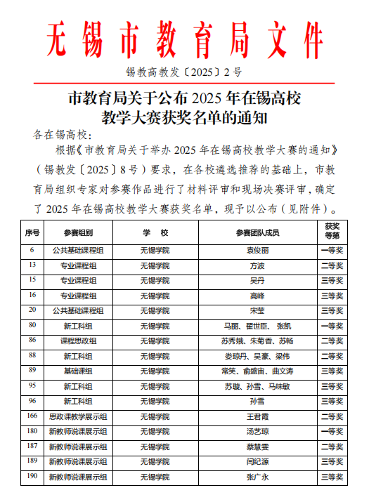 近日,由无锡市教育局高等教育处主办的“2025年在锡高校教学大赛”评选结果揭晓。经过激烈角逐,我校教师团队荣获一等奖3项、二等奖5项、三等奖8项。