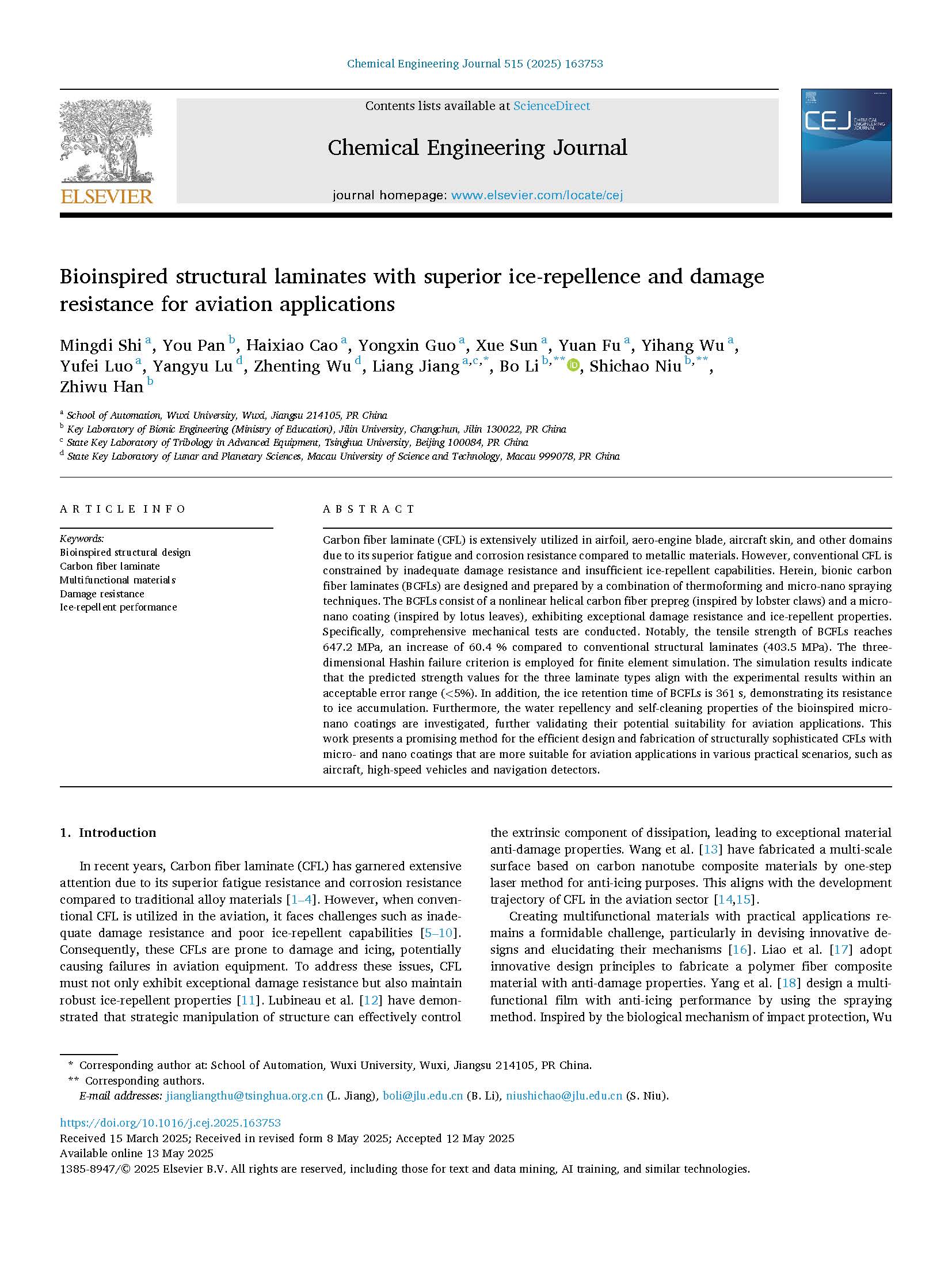 近日,自动化学院蒋亮教授团队在中科院一区TOP期刊Chemical Engineering Journal发表最新研究成果《Bioinspired structural laminates with superior ice-repellence and damage resistance for aviation applications》。该论文以无锡学院自动化学院为第一完成单位,自动化学院教师史明狄为论文第一作者,自动化学院教授蒋亮为第一通讯作者。