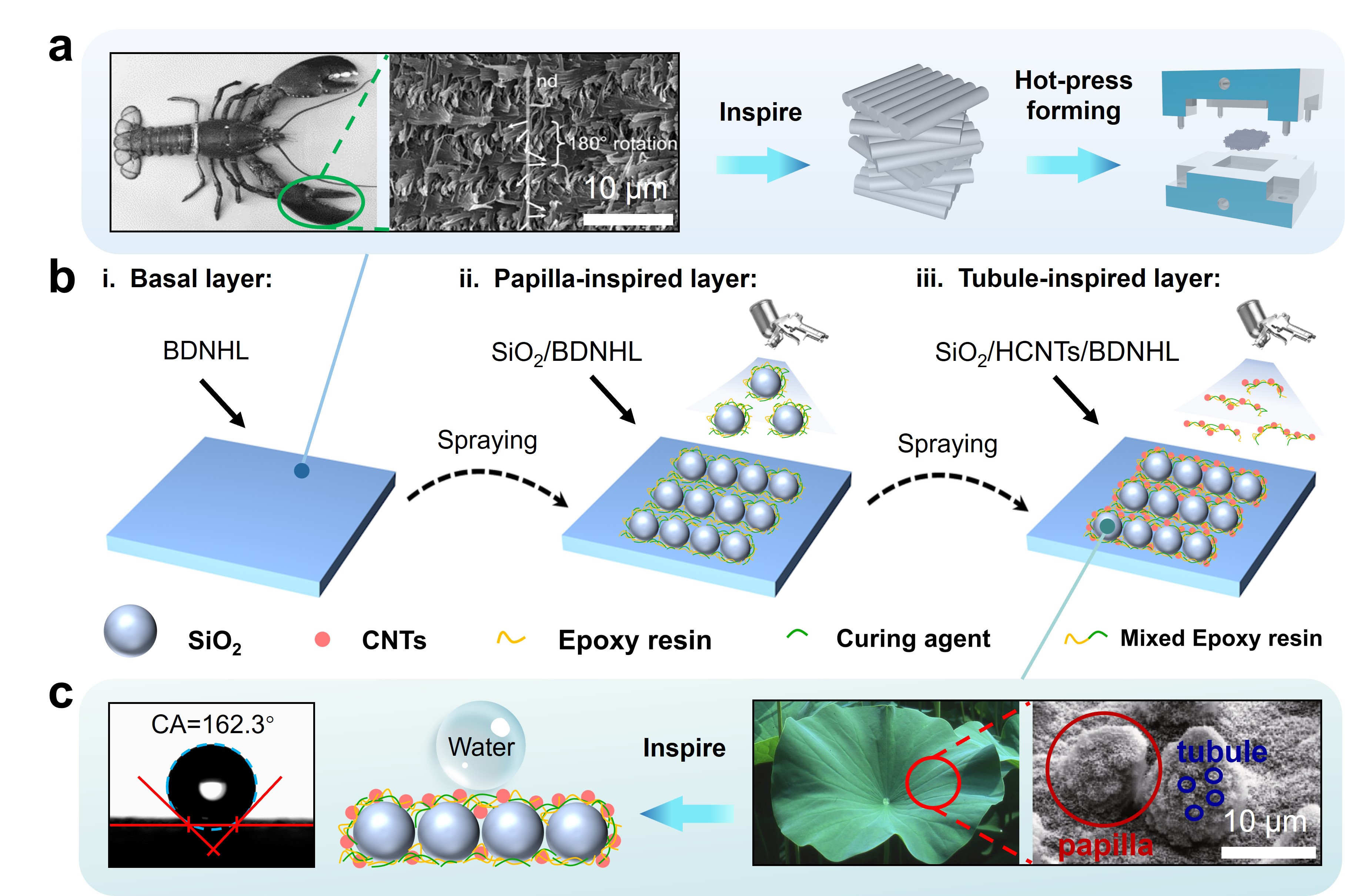 该论文采用热压成型和微纳喷涂相结合的方法,设计并制备了一种仿生多功能碳纤维层合材料。仿生层合材料由非线性螺旋结构碳纤维板材(灵感来自龙虾钳)和多尺度微纳涂层(灵感来自荷叶)组成,具有优异的抗损伤性能和防冰性能。通过力学和防冰相关的综合试验探究与仿真分析,解析了仿生碳纤维层合材料的抗损伤和防冰机理,验证了其在航空应用中的潜在适用性。这项研究成果为设计和制备结构精巧的碳纤维层合材料提供了一种有效的方法,能够适用于航空领域多种器件,如飞机机翼、航空发动机叶片等,具有较强的实际应用价值。