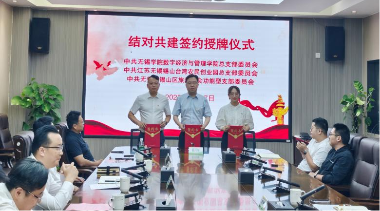 为深化党建引领作用,推动校地企协同发展,5月27日上午,数字经济与管理学院党总支与锡山台创园党总支、锡山区旅游协会功能型党支部在锡山国家现代农业产业园(台创园)会议室举行党建共建活动。锡山区农业农村局党委书记、台创园管委会负责人蒋新岐,台创园党总支副书记、管委会副主任费晨波,数字经济与管理学院党总支副书记李诗雅,台创园党总支委员、党政办主任孙晓强,锡山区供销社党委副书记、副主任虞科峰,锡山区文化体育和旅游局旅游科科长朱小叶,锡山区旅游协会党支部书记杨锋及锡山区“五个一”特色农业代表等出席活动。